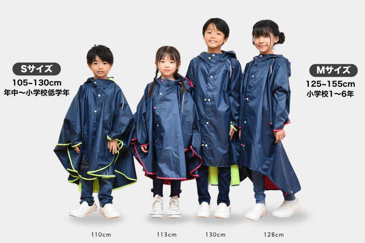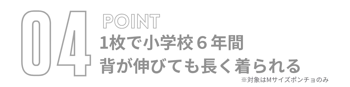 子どもの身長は小学生の間に平均30cmも伸びます。それに合わせて、ポンチョのサイズも長く使えるように設計しました。