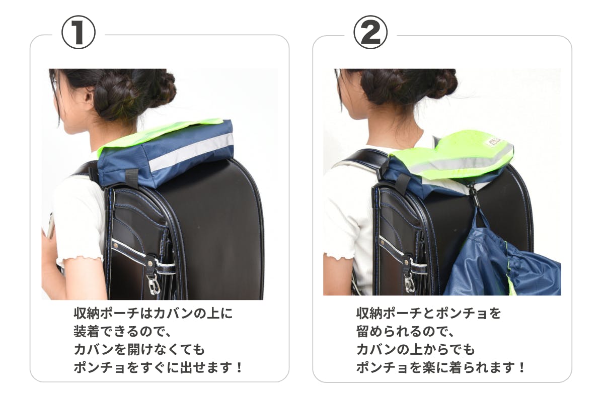 収納ポーチから、レインポンチョをすぐに取り出せて、ランドセルの上から一人も簡単に着用できます。