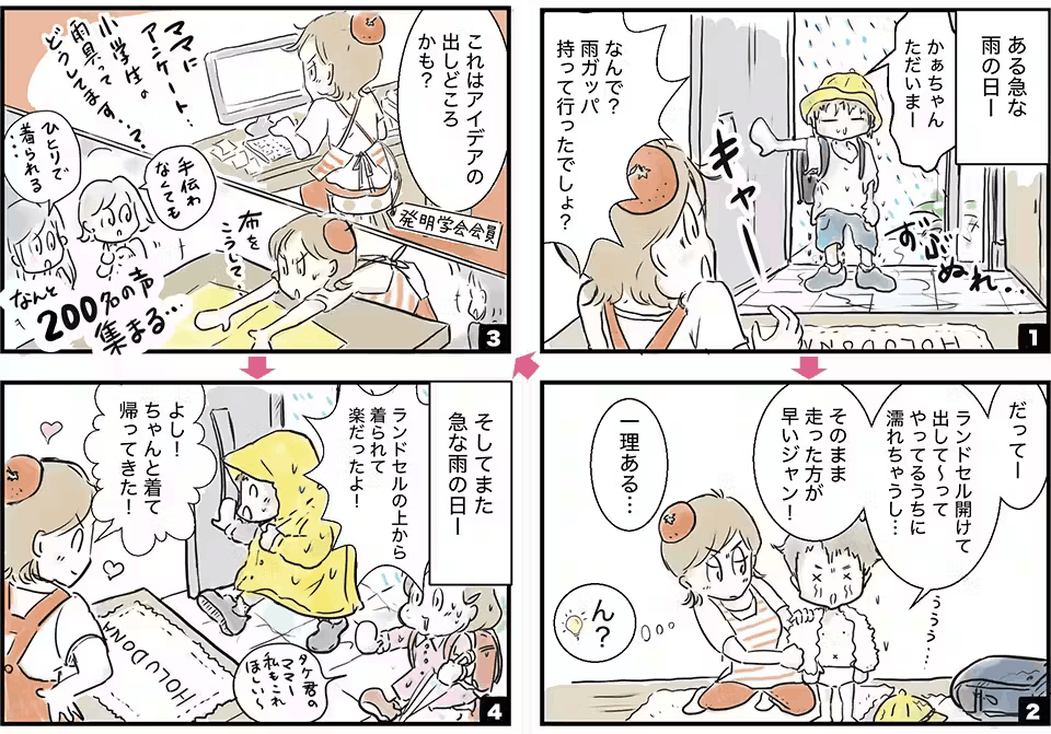 「どうすれば子どもたちがぬれずに、簡単にかっぱを着て帰ってこれるだろうか?」