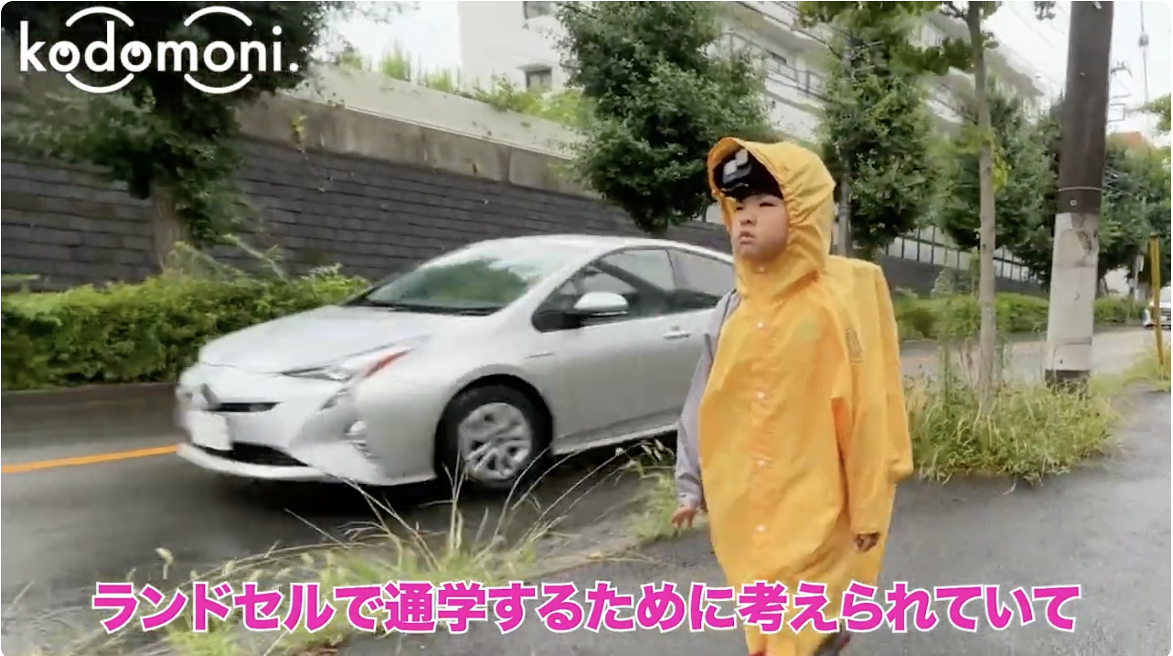 ー「Kapapaレインポンチョ」の実物を子どもが着用して、頭につけたカメラでの視界の違いを実験。