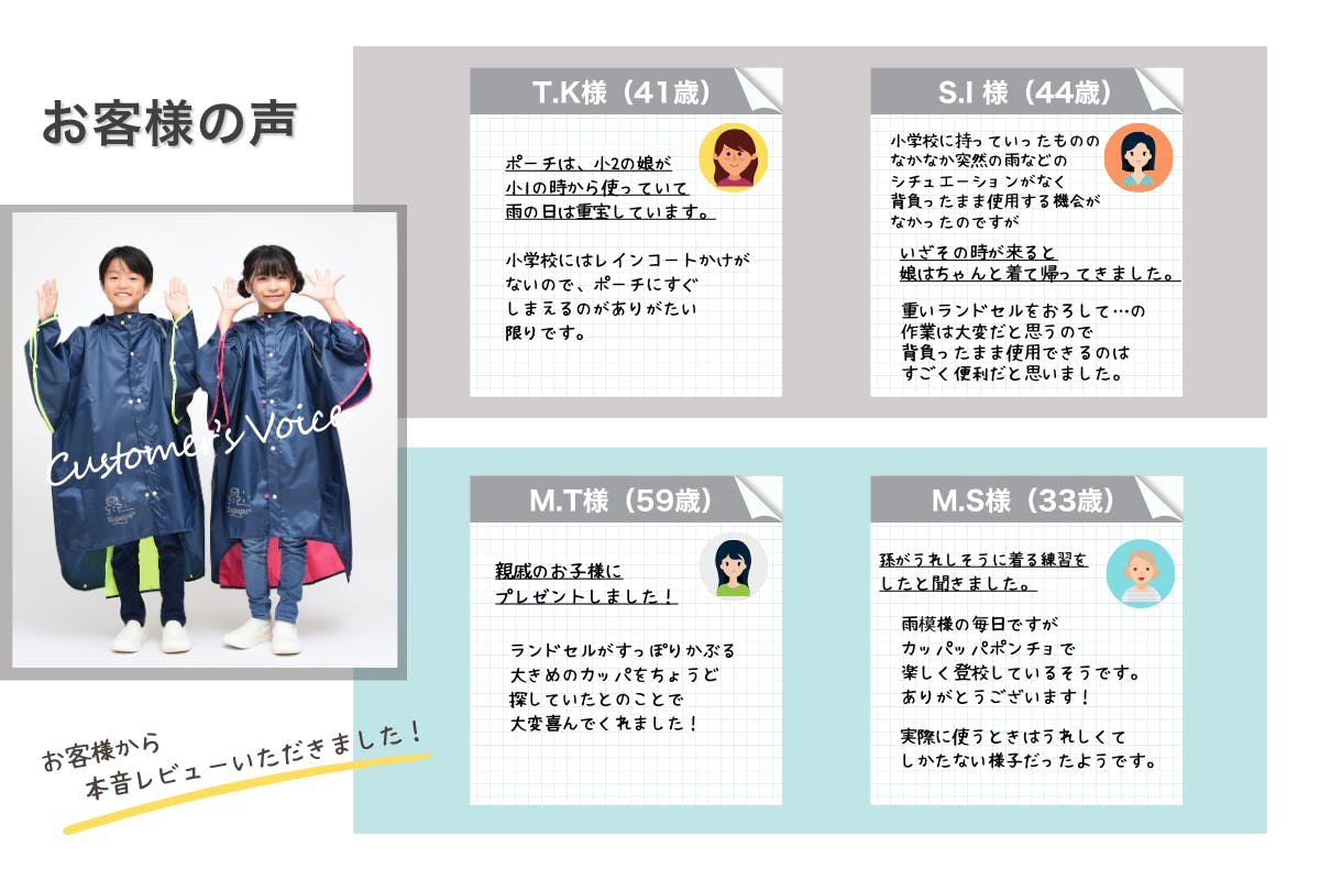 こんばんわ!「子どもとママの移動を安全で楽しいものにしたい」そんな思いでモノづくりを行う " HOLUDONA 代表和田 " です。今回は、Kapapaをご愛用いただいている皆さまから届いた、嬉しいお声やキッズモニターのレビューをご紹介します!まずご紹介したいのは、皆さまからの嬉しいご報告!実際のお声をいくつかご紹介します。このほかにも・・・ランドセルを背負ったままゆったり着られる設計に、子どもたちからも大好評♪・「動きやすい!これなら着る!」と飛び跳ねて、くるくる回って楽しそうでした。・ 生地がたっぷりで通気性が良いので、蒸れずに着やすいようです!▼こちらは、「Kapapa School」とは違うシリーズですが、ホルドナのポンチョのモニターキッズのお声。別シリーズのレビュー(面ファスナー・カラー・生地が異なります)この他にも・・・「お値段は少々お高めに感じるかもしれませんが、買い替えの心配がないので結果的にお得だと思います。」(ママ)また、実際に来たお子様からの意見や、プレゼントしてとても喜ばれたと言った報告をたくさんいただいています。=====ーモニターママからのメッセージ!ー「新一年生におすすめ。両手があいて、帽子まで被れるから便利だよ。」「荷物も濡れないし着やすいよ」「6年間使えるレインポンチョがあるよ!素材も高級感あるよ!ゆとりのあるデザインだから長く使える」「雨の日に帰ってきて、面倒なびしょ濡れのお洋服のお洗濯しなくていい。雨の日も楽しく登下校出来る。」「入学祝いのプレゼントや入学の時の必須アイテムとして最適なレイングッズ!」「高学年まで長く使えるから何回も買い替えなくていいよ」など、作って良かった...!と心から思えるとっても嬉しいメッセージをいただきました。======Kapapaレインポンチョは、雨の日の通学やお出かけを、もっと楽しく、もっと快適にするために作られました。ただ、子ども用のかっぱにしては、確かにお手頃とは言えない価格かもしれません。ですが、このかっぱはホルドナが自信を持って皆さまに紹介できる商品に仕上げています。私たちの思いは、「子どもとママの移動を安全で楽しいものにしたい」ということです。小学校の通学時の雨対策に1つ備えることにより、心配が安心に変われば幸いです♪最後までお読みいただきありがとうございます!皆さまの温かい応援が力になっています!\リターン品一覧はコチラ/ー リターン情報!あとわずか ー・収納(吸水)ポーチ/ 超超超早割 終了・ポンチョM+収納ポーチ(吸水) / 超超早割 終了・ポンチョM+収納ポーチ(軽量) / 早割 残り1人・ポンチョS+収納ポーチ(吸水)/ 超超早割 終了ー 商品について ー【リターン一覧表/これを見れば一目瞭然!】https://camp-fire.jp/projects/795952/view/activities/694946#main【適応身長サイズ /  身長別に同サイズを比較しました!】https://camp-fire.jp/projects/795952/view/activities/695027#mainンポンチョと収納ポーチ / サイズ・カラーSPEC】【フードの特徴】https://camp-fire.jp/projects/795952/view/activities/695280#mainー 小学校への雨の通学情報 ー【雨の日の通学対策について】https://camp-fire.jp/projects/795952/view/activities/696235#main【雨の日の悩みは「かっぱっぱ」が解決】https://camp-fire.jp/projects/795952/view/activities/695332#mainまた不明な点は、お気軽にプロフィールの「メッセージを送る」からご質問くださいね。(コメントを頂いた方へ、コメントへの返信ができない事に後から気づきました。大変お手数おかけしますが、メッセージを送るから再度ご連絡いただけたらと思います)▼メッセージはこちらhttps://camp-fire.jp/mypage/messages▼プロジェクトページhttps://camp-fire.jp/projects/795952/---------------------------------------------------------「Kapapa(かっぱっぱ)」は、現役ママたちが実体験をもとに商品づくりをしています。皆様のご支援、心よりお待ちしております。HOLUDONA代表・和田美香、スタッフ一同---------------------------------------------------------▼HOLUDONA株式会社神奈川県横浜市神奈川区六角橋2-23-19HP https://holudona.com/▼Kapapa School について商品やプロダクト情報をリアルタイムに発信中!フォローしてね♡・インスタ https://www.instagram.com/kapapa_official/・X https://x.com/holudona/-------------------------------------------