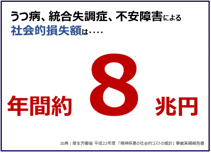 メンタルヘルスの不調は日本の大きな社会課題になっているのです。それは経済的損失という面でも表れています。うつ病、統合失調症、不安障害による社会的損失額はなんと約8兆円にも上ります。