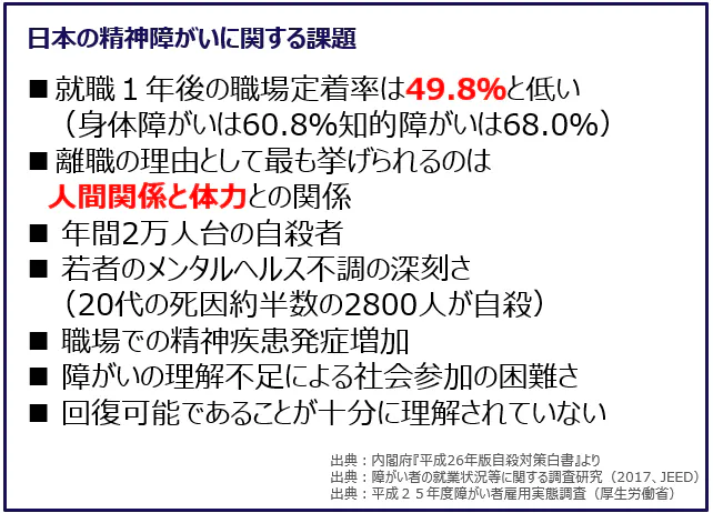 ストレス社会、核家族化、情報過多などを契機として日本の精神障害者数は増加傾向にあり、08年の患者調査では、精神疾患の患者数は約323万人でしたが20年の調査では外来だけで600万人近くにも上っています。精神疾患の早期発見・早期治療、ケアシステムの構築、精神障がい者の法定雇用率アップによる社会参加促進など、様々な政策、活動により、少しずつ精神障がいへの理解が深まっていますが、若者のメンタルヘルスの不調の深刻さ、年間約二万人台の自殺者(G7内トップ)、高い離職率、職場での精神疾患の発症増加、障がい理解の不足による社会参加の困難さ、回復可能であることが十分に理解されていないなど依然として多くの課題があります。