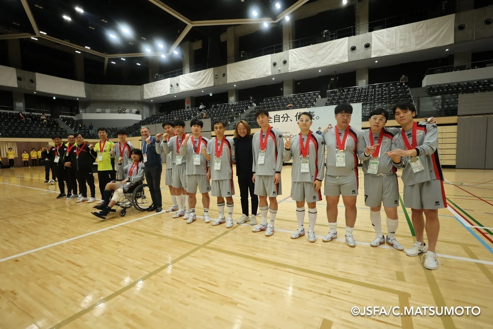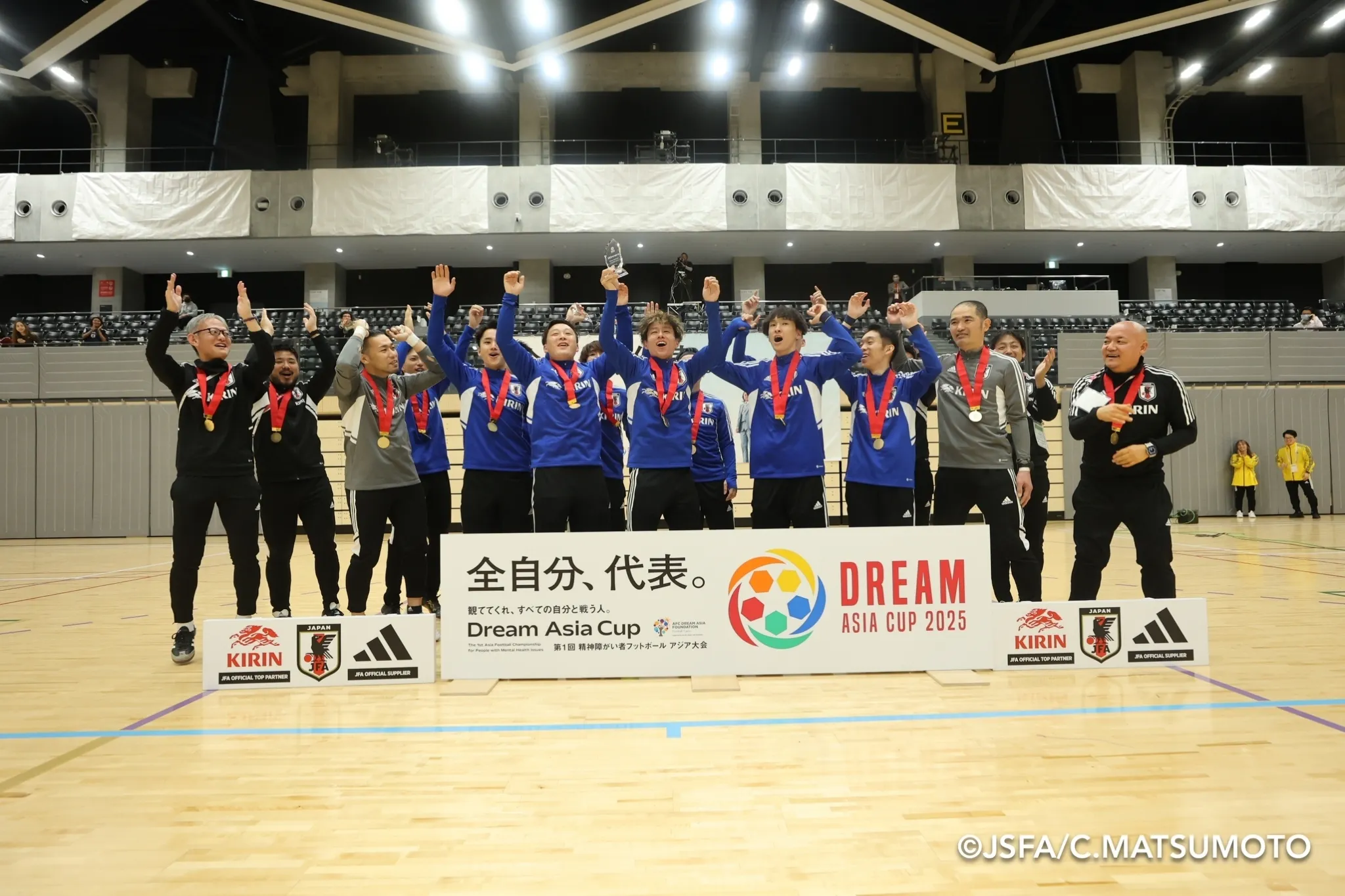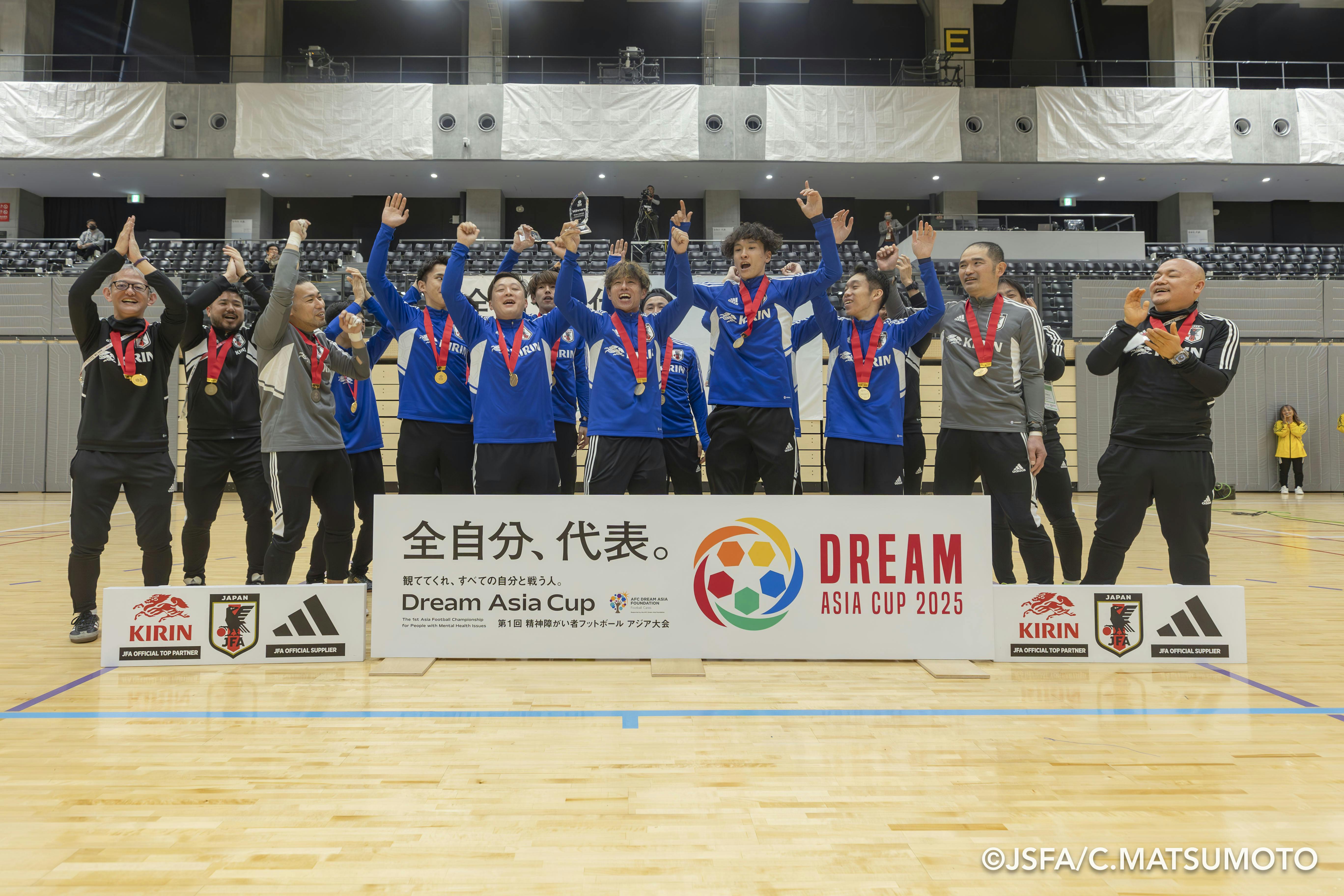 2025/02/28 20:53アジアの初代チャンピオンは日本に!全ての日程が終わり、表彰式が始まります。日本障がい者サッカー連盟・北澤豪会長から「大差がついているのに見応えのある大会は今まで見たことはなかった」という講評をいただきました。最終順位は1位:日本2位:韓国3位:台湾4位:DAU(参考成績)アジア初のソーシャルフットボール国際大会は、日本が優勝という形で終了しました。それぞれの国の表彰の姿には、喜びと充実感が滲み出ています。障害も国籍も性別も関係のない、みんなが混じり合った世界を表彰式終了後に、国籍も障がいも全てが混在した一つの「輪」ができました。ソーシャルフットボールは勝ち負けだけを争うのではなく、お互いの理解を深めたり、居場所や気の許せる仲間を見つけたり、自分自身を取り戻すきっかけを見つけたり、そんな「取り組み」を指します。この取り組みの「輪」がどんどん広がり、すべての精神障がい当事者がいきいきと過ごしやすく、前向きに生きていける環境が一刻も早く確立することを願っています。夢は続いていく大会が終わった後の静けさの中、宿舎のホテルの一角に、日本代表選手とスタッフDAUの日本からの選抜メンバーが集合していました。前回2018年のローマ大会以来、コロナ禍を経て長く続けられてきた第3期日本代表活動も、DREAM ASIA CUP終了を以てひとまずの解散となります。ここまで共に歩んできた選手・スタッフ一人一人が感謝と胸に秘めた想い、これからの抱負などを語ります。うまく言葉に言い表せない選手、涙と共に想いを語る選手、その姿は様々。しかしやり遂げた充実感は皆同じものを感じているようでした。夢はまだまだ続きます。2026-2027にかけて(詳細未定)はDREAM WORLD CUPが予定されており、そしてその後すぐに台湾での第二回DREAM ASIA CUPが控えています。日本代表団はまたすぐに再始動しなければなりません。一つに結束したこの代表団がそのまま次のステージに進むのか、あるいはメンバーを大幅に入れ新たな代表団を組むのか、それは今はわかりませんが、ソーシャルフットボール界だけでなく、精神障がい当事者全体のために勇気を持って活動をしていこうとする選手たちを、私たちは誇りに思います。そしてこれからも全力でサポートしていきます。大会出場してくださった全てのチーム、スタッフ、大会開催にあたりご尽力くださった皆様、現地へご来場くださり直接声援をかけてくださった皆様、クラウドファンディングやその他の形でご支援くださった皆様、ご支援はできなくとも心の中で静かに応援をしてくださった全ての皆様へ、心からの感謝を申し上げます。ありがとうございました。(完) もっと見る