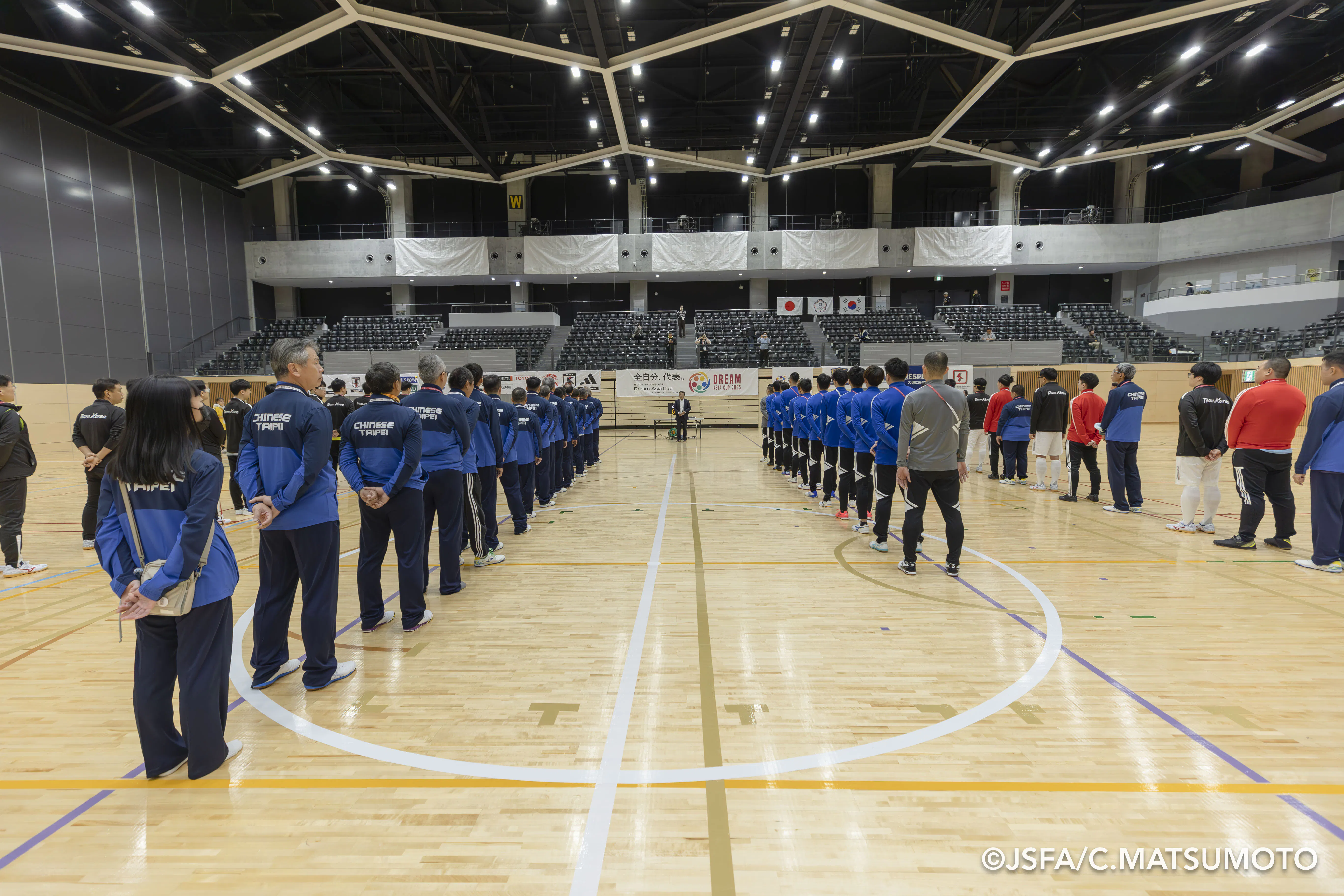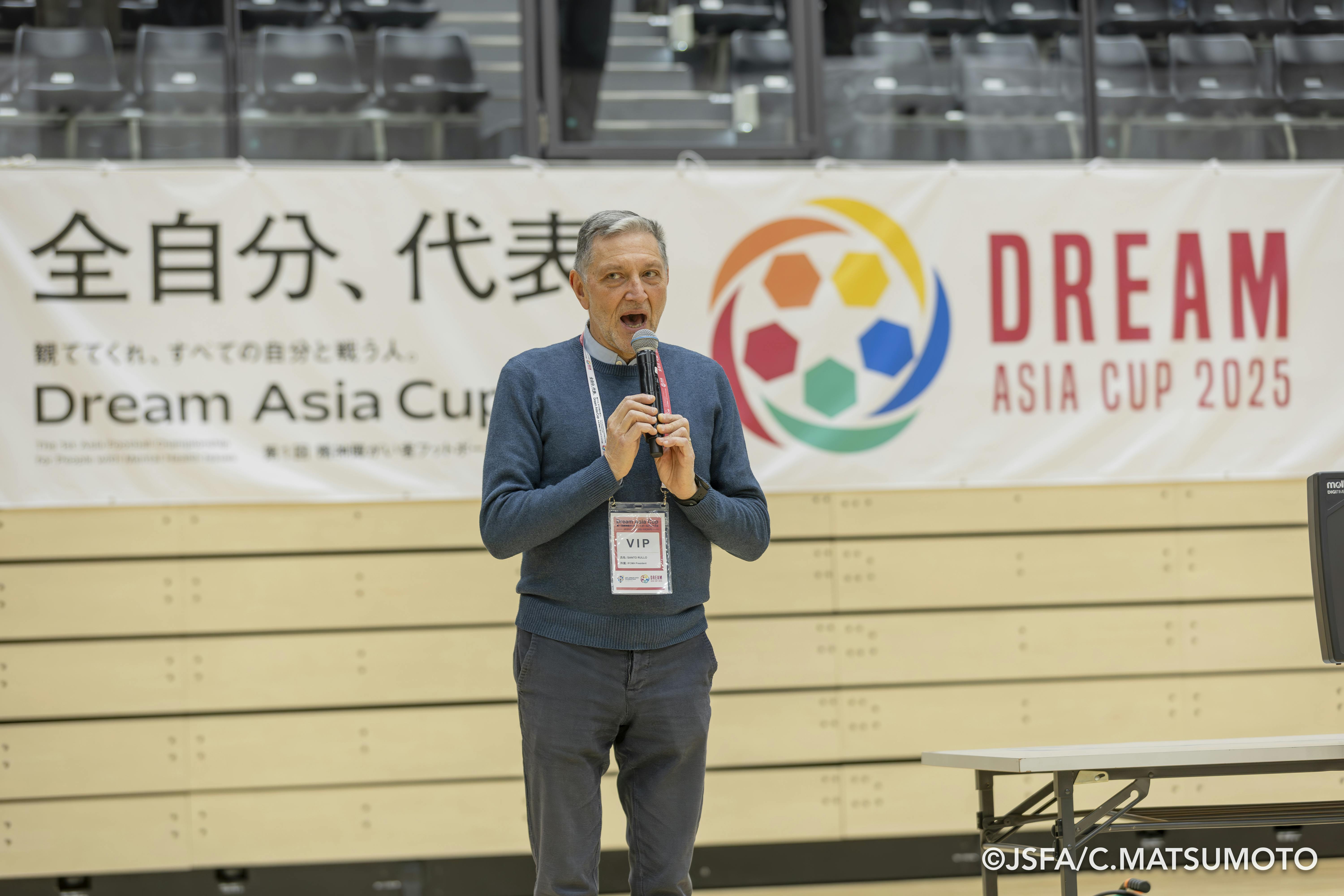 4列の選手団を前にSanto Rullo氏が掲げた (予定※変更になる可能性があります)「DREAM WORLD CUP」2026年開催決定の発表を号砲として、第1回DREAM ASIA CUPの火蓋が切って落とされました。