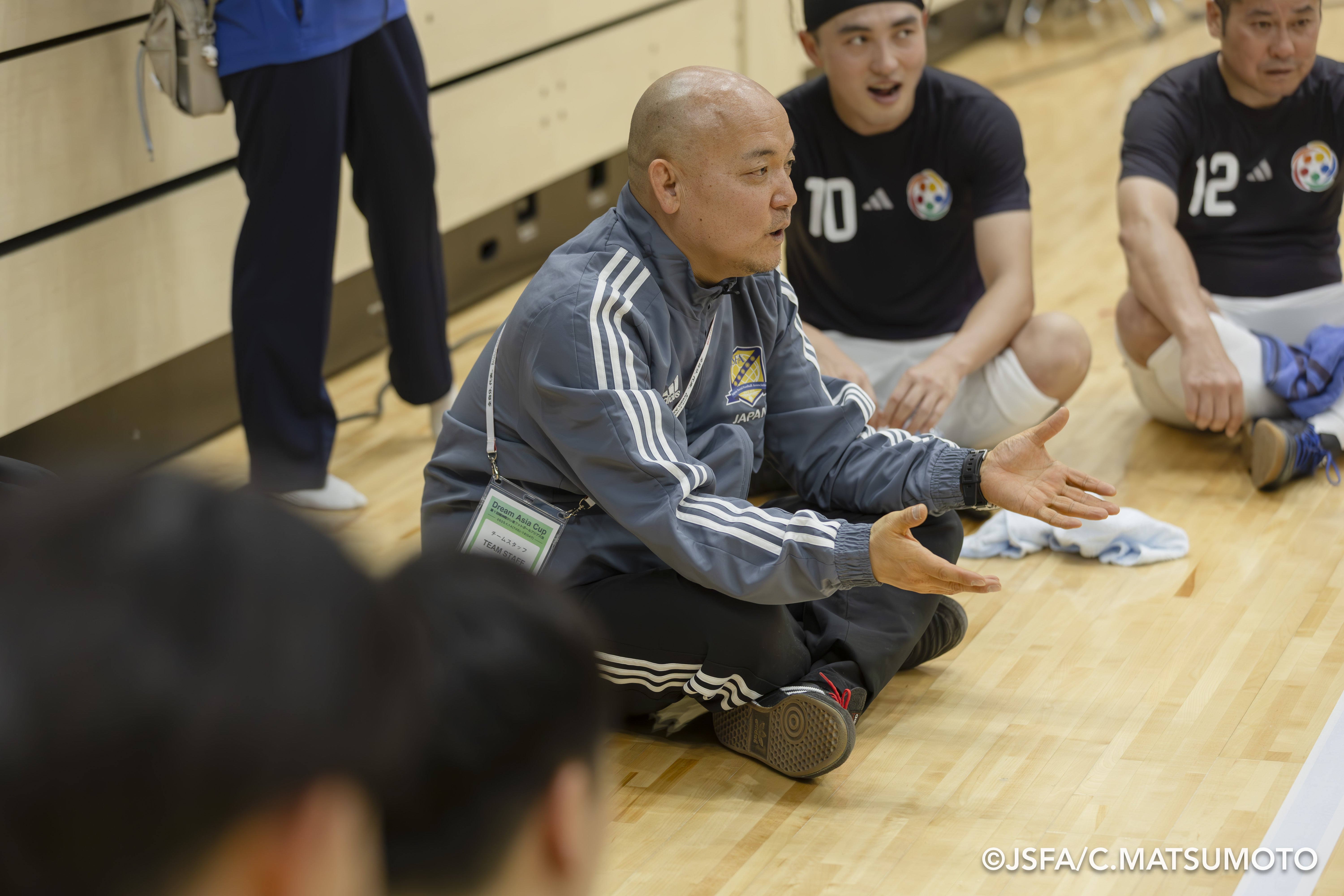 DAUとしての初めての試合、選手の緊張をほぐすために真庭監督が穏やかな声で語りかけます。終始和やかでユーモアたっぷりの真庭監督らしい掛け声が、選手の緊張をほぐしていきます。