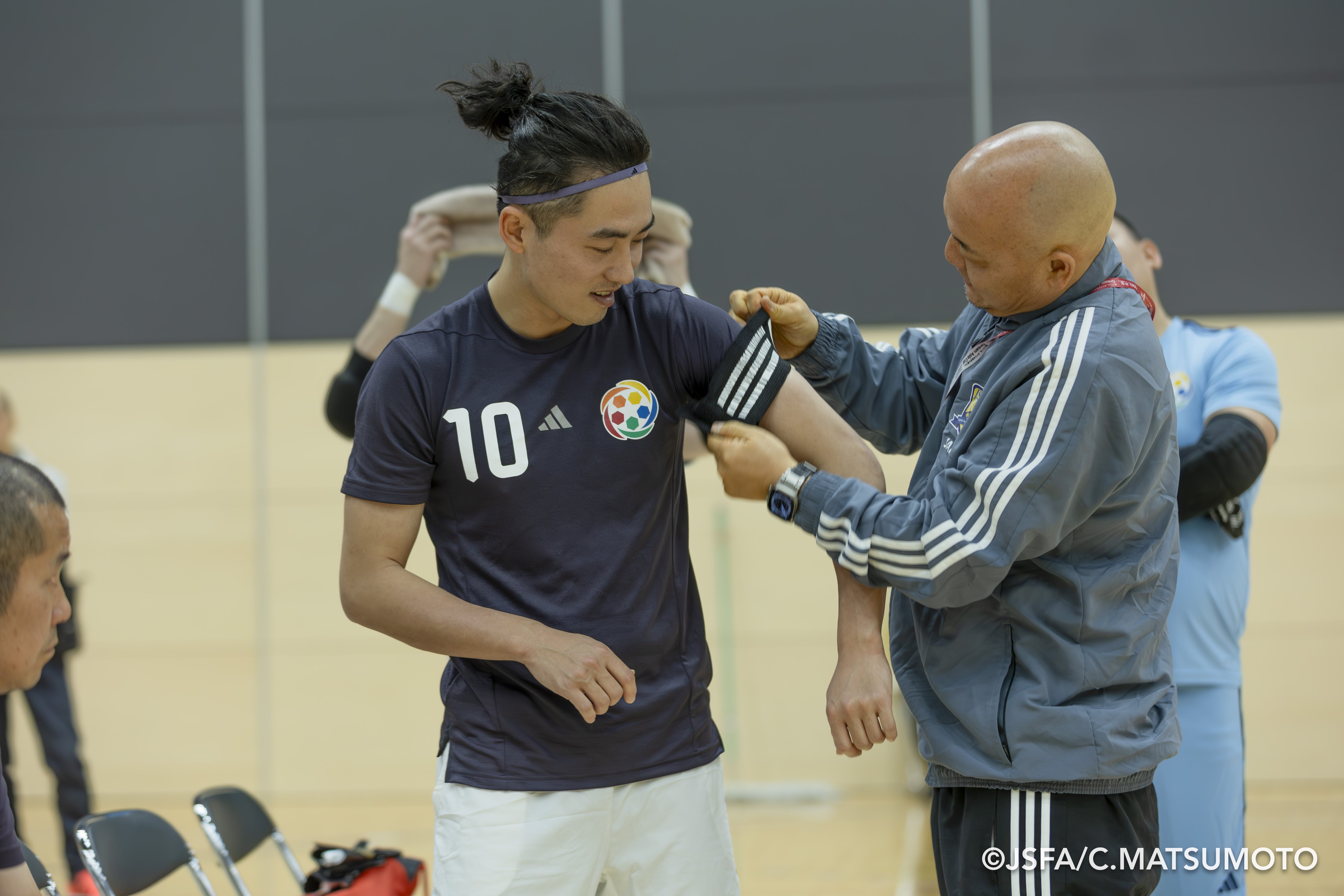 DAUのこの日のキャプテンは山田選手に。真庭監督にキャプテンマークを巻いてもらう山田選手、表情も和らぎます。代表に選出されなかった複雑な思いを抱えつつも、大事な仲間でもある日本代表との試合に胸を躍らせていたのかもしれません。
