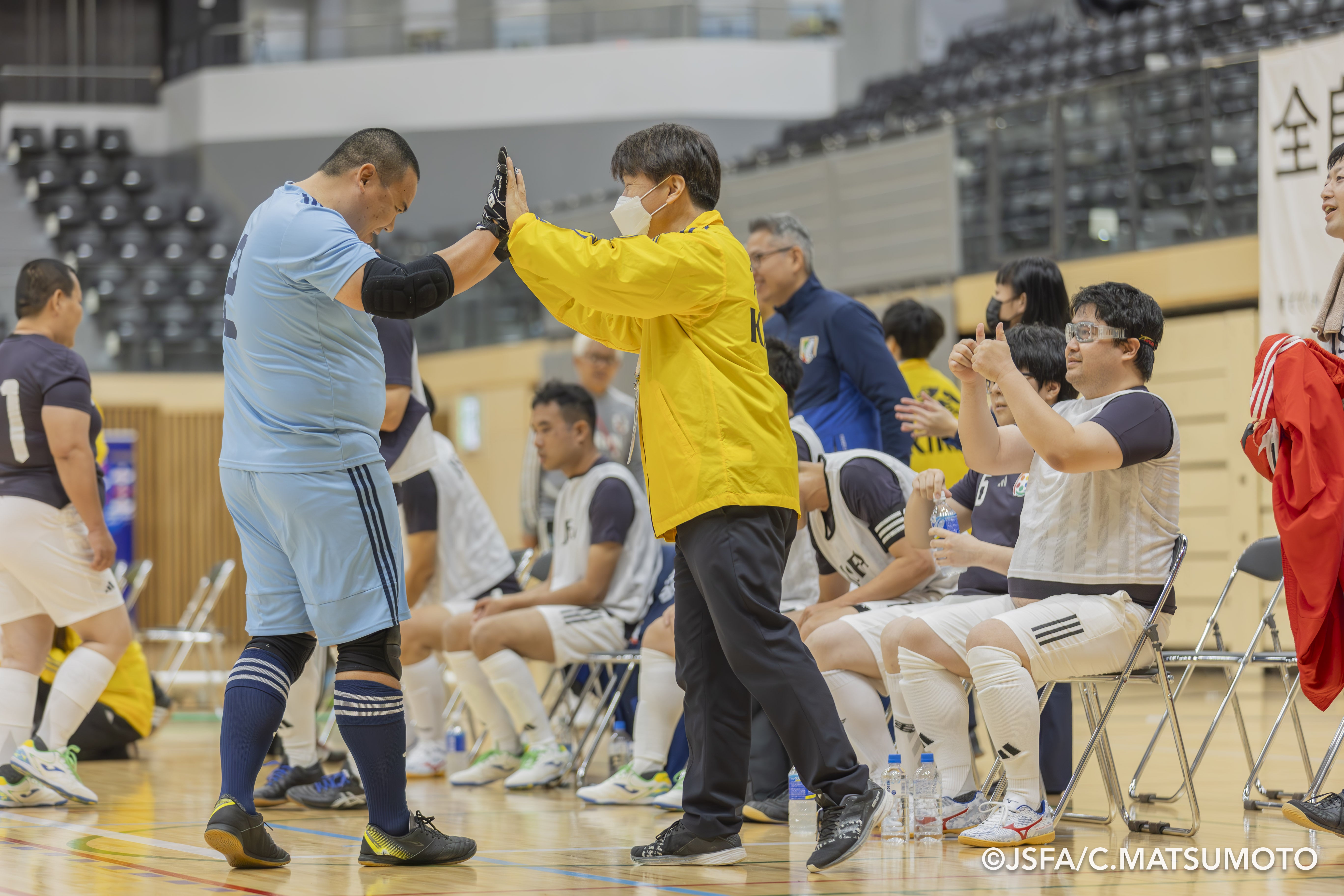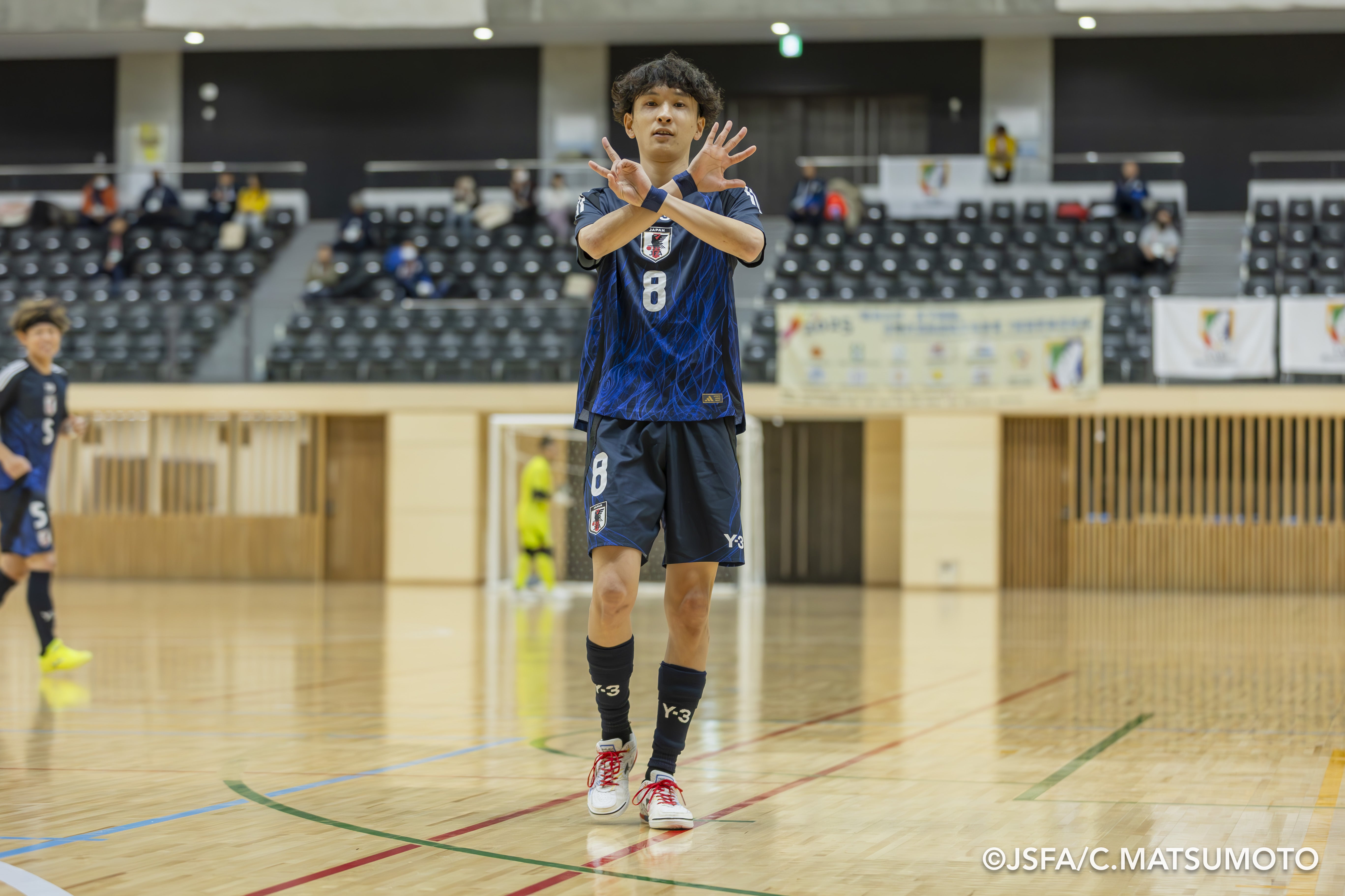 ゴールを決めた直後、カメラに向かって指を構える日本代表・伊勢田選手。空にかざす指は「2」と「5」を模っていました。