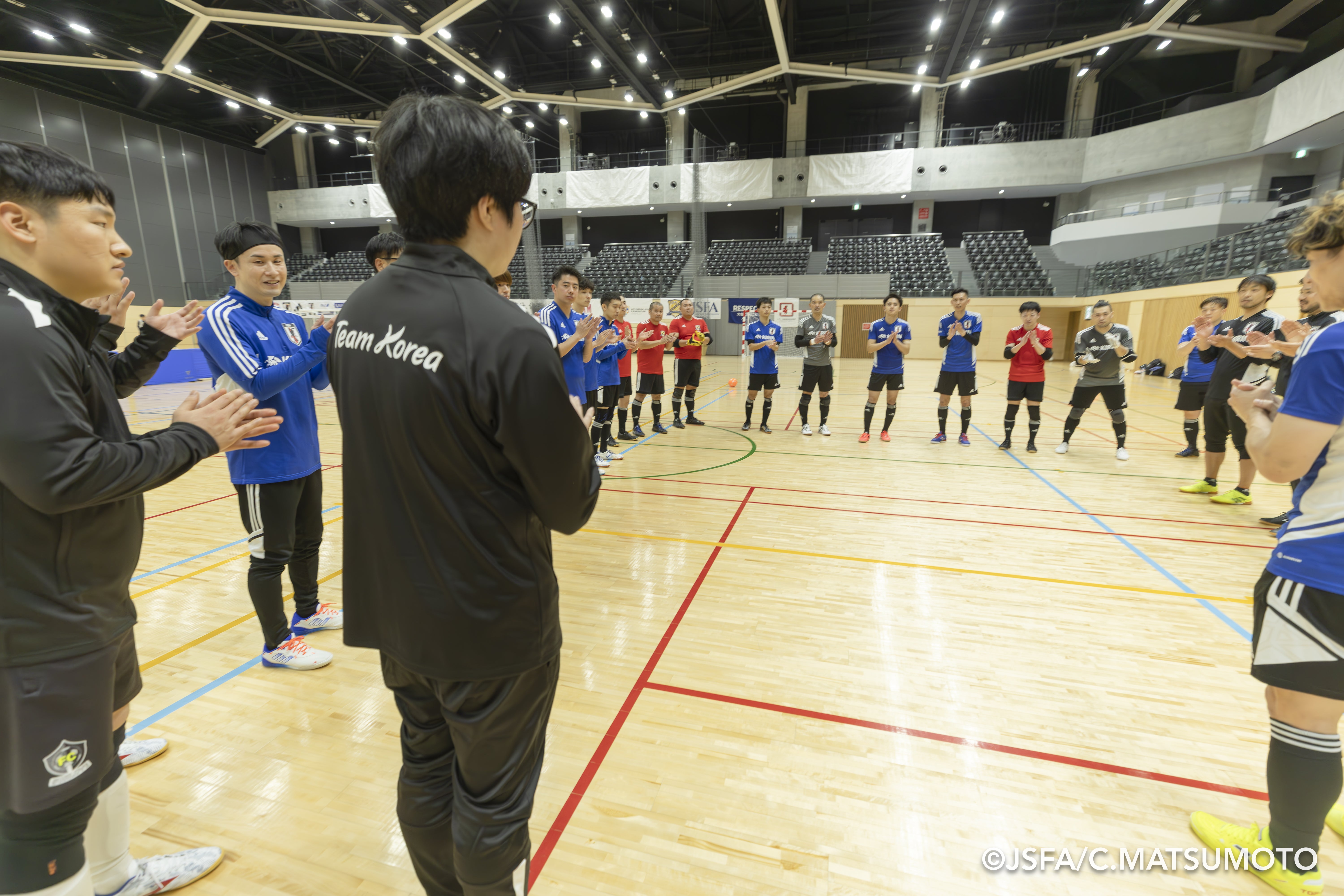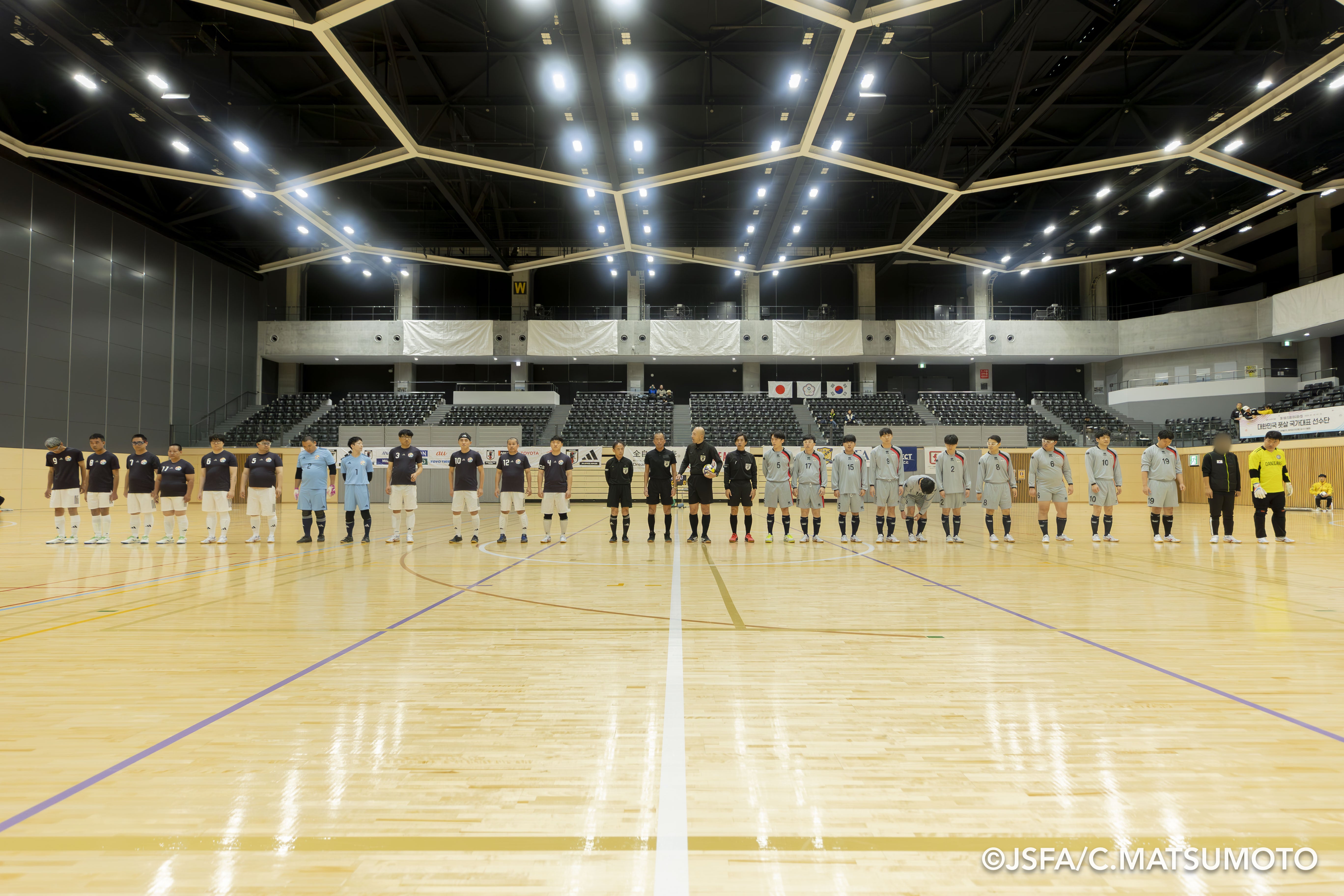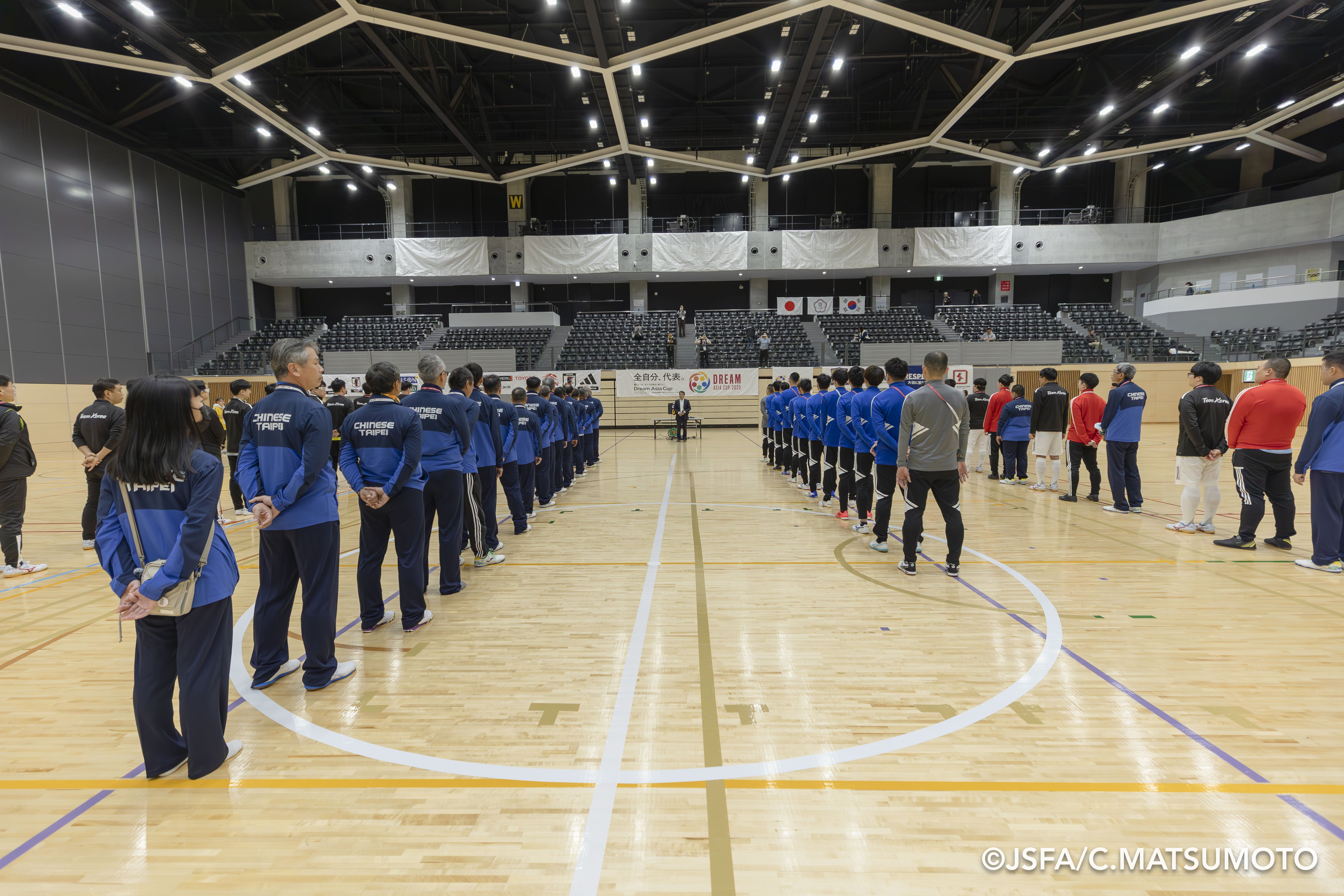 日本代表ユニフォームに初めて袖を通す選手たち試合5分前。ウォーミングアップを終えた日本代表選手たちは、ロッカールームに集合していました。サッカーA代表と同じユニフォームに初めて袖を通す選手たち。日本代表ユニフォームの重さを静かに語る奥田監督を見つめる彼らの中には、感極まって涙を浮かべる選手も。このユニフォームを着ることが叶わなかった、同じ強化指定選手たちの分も自分たちが走ろう、そして歴史を作ろう。そんな想いを胸に選手たちは固く円陣を組み、そして力強い咆吼を轟かせました。いよいよ運命の初戦、相手は台湾です!初めての対戦、日本と台湾経験の豊富な日本代表と、フットサル歴の浅い選手が多く参加している台湾代表とでは、大きな力量差があります。予想はされていましたが、前半のうちに日本代表が20点以上を奪う一方的な展開。しかし、日本代表は構成を緩めず、容赦をすることなくその後も得点を重ねていきます。なすすべのないように見えた台湾でしたが、徐々に試合に慣れ、日本代表の攻撃を止めるシーンが増えてきました。しかし日本代表も手を緩めることはありません。大量失点をしても決して諦めることのない台湾に対し、攻め続けること、自分たちのフットサルをやり続けることが最大のリスペクトだからです。日本は34点をあげ、台湾は一矢報いることかなわずゲームセット。しかし、敗れた台湾の選手に悔しさや悲嘆の表情はなく、笑顔の選手の姿も。むしろこれまで戦ったことのない強豪に立ち向かった「やり切った感」が滲み出ていました。--------------------------------------予選①日本 34-0 台湾--------------------------------------