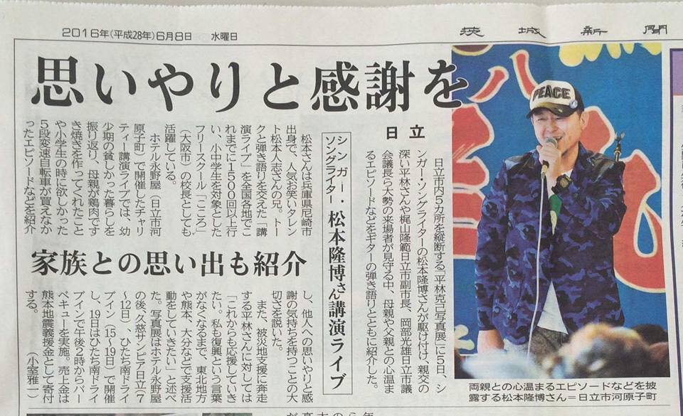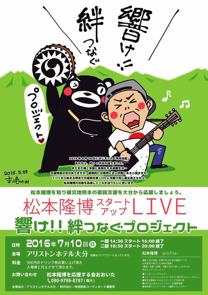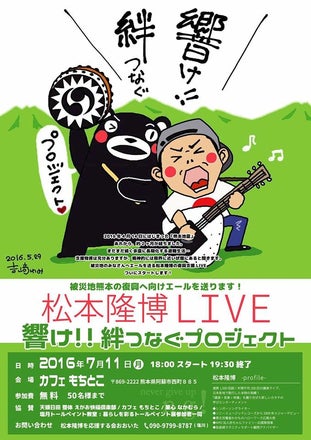 ぜひサイトでそのいきさつを見て頂き、講演やライブに精力的に動かれている松本隆博さんを一緒に応援して頂き、4月14日に始まった熊本地震で被災された皆さまの心にも、あなたの大切な人と同じように寄り添っていただけたらとの思いで、このプロジェクトを立ち上げました。