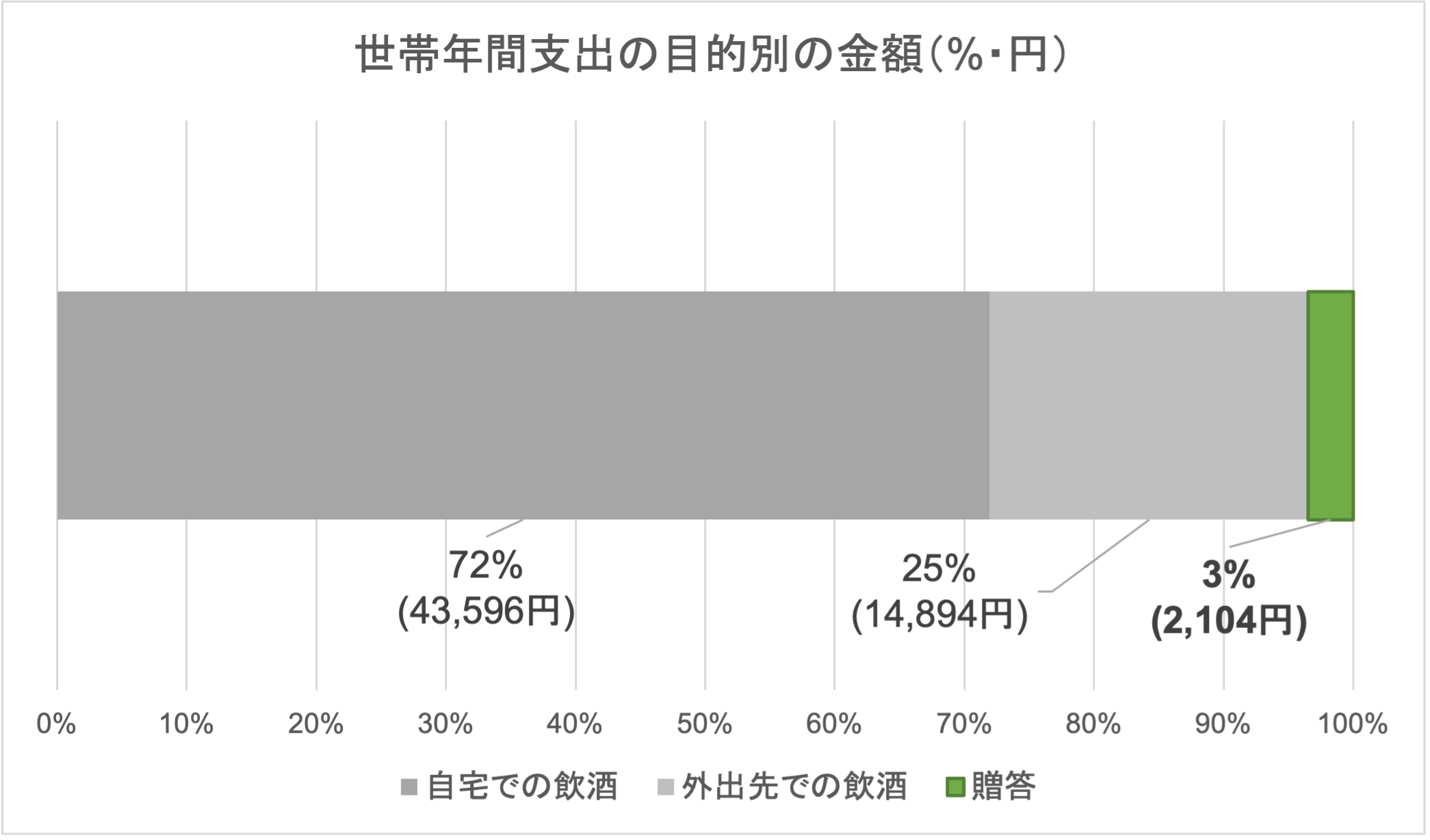 総務省「家計調査(家計収支編) 時系列データ(二人以上の世帯)」2023年分より菊美人酒造推計。自宅での飲酒:用途分類の酒類、外出先での飲酒:用途分類の一般外食 *品目分類の一般外食に占める飲酒代割合、贈答:品目分類の酒類-用途分類の酒類
