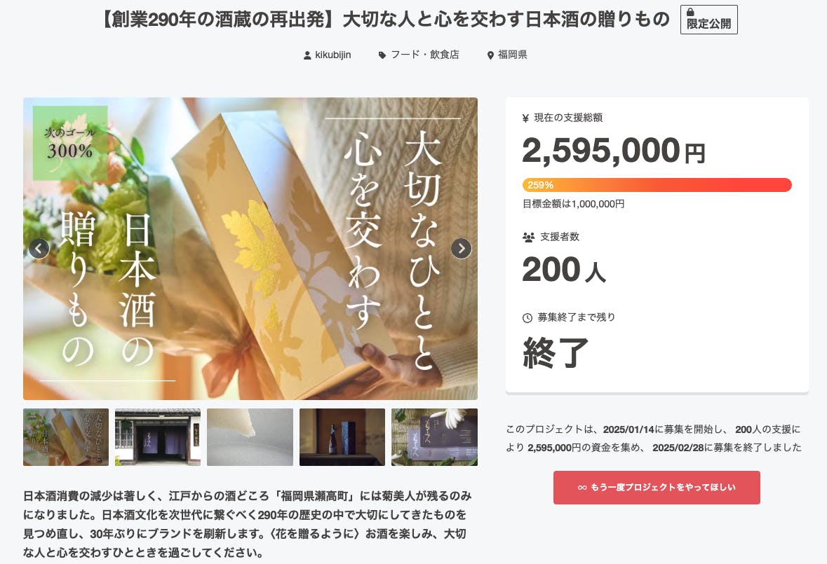 2月28日をもちまして、菊美人のクラウドファンディング<【創業290年の酒蔵の再出発】大切な人と心を交わす日本酒の贈りもの>が終了しました。この度は、菊美人の新しい一歩の背中を押していただき、誠にありがとうございました。
