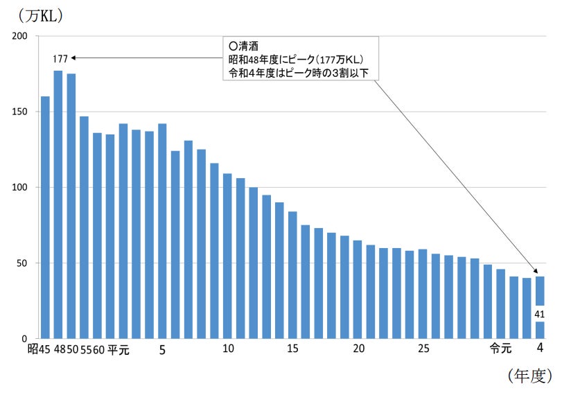 日本酒の消費量は1973年をピークに年々減少しています。