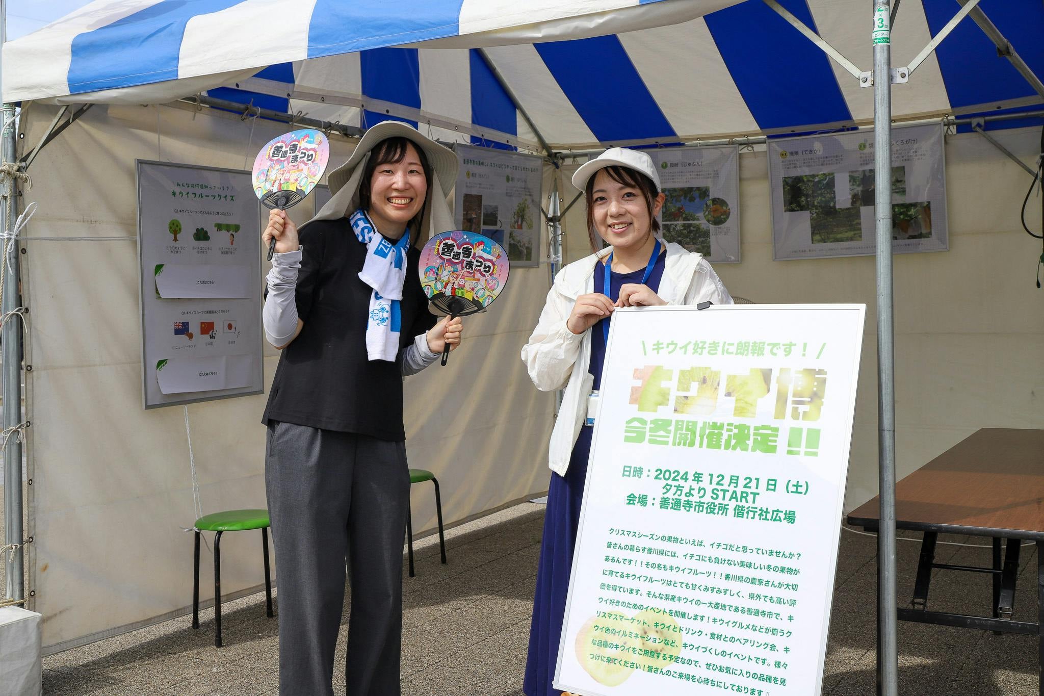 地元の夏祭りでキウイ博の開催と、地元産のキウイフルーツをPR!キウイの生産風景写真やクイズパネルを展示した他、キウイフルーツティーやキウイソーダを振る舞いました。