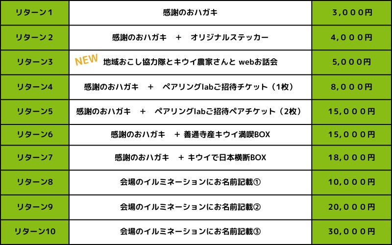 ご自宅でお楽しみいただけるものや、『キウイ博』の当日にお楽しみいただけるもの、様々なリターンをご用意しております。