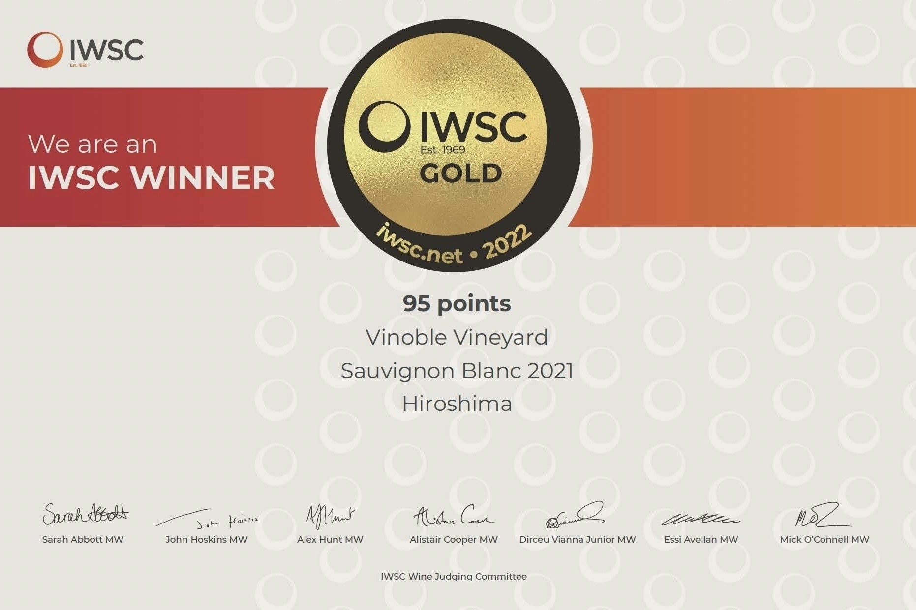 その翌年ロンドンで行われた世界最大級のワインコンペティションであるIWSC(インターナショナル ワイン アンド スピリッツ コンペティション)2022において弊社のソーヴィニヨンブランが日本でのワイナリーでは通算4社目、西日本ワイナリーとしては初となる金賞を受賞しました。ソーヴィニヨンブランで金賞を受賞したのは弊社とニュージーランドのワイナリーの2社のみで、どちらも95点でしたので、IWSC2022においては世界最高得点のソーヴィニヨンブランとなりました。この受賞は私たちの大きな励みとなり、次なる目標である「貴腐ワインでの金賞」を目指し、情熱を注いでいます。