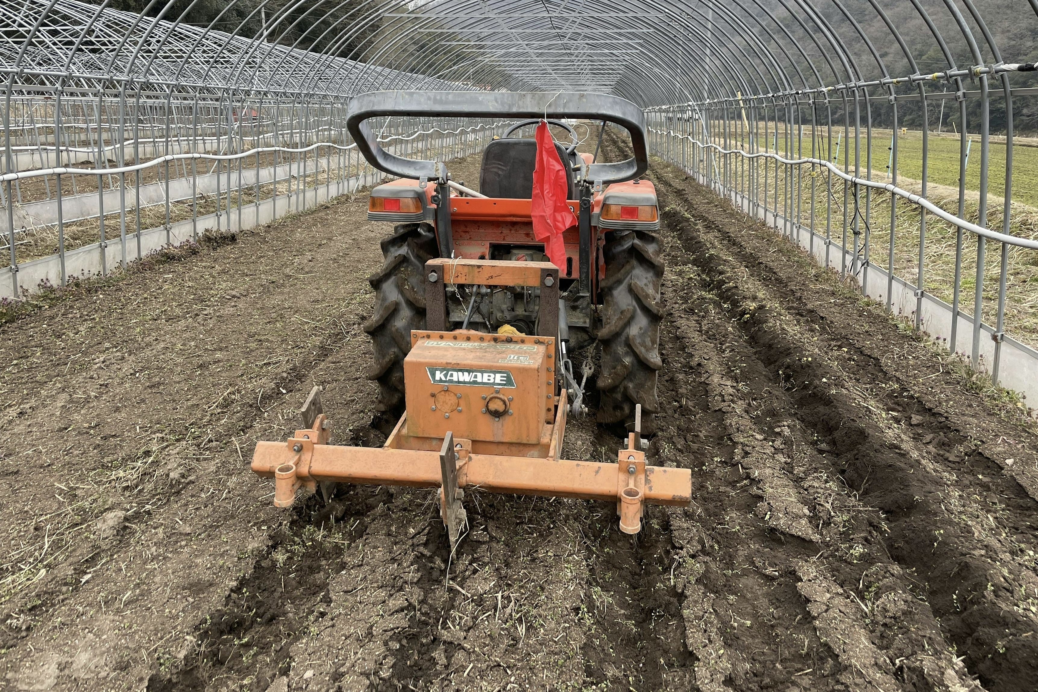 現在植栽予定地の畑にはハウスの骨組みが組まれていますが、既存のハウス設備を活かし、ハウスの中に棚を建てる予定です。葡萄が育った時にはビニールを上部に設置し、雨から葡萄を守る予定です。