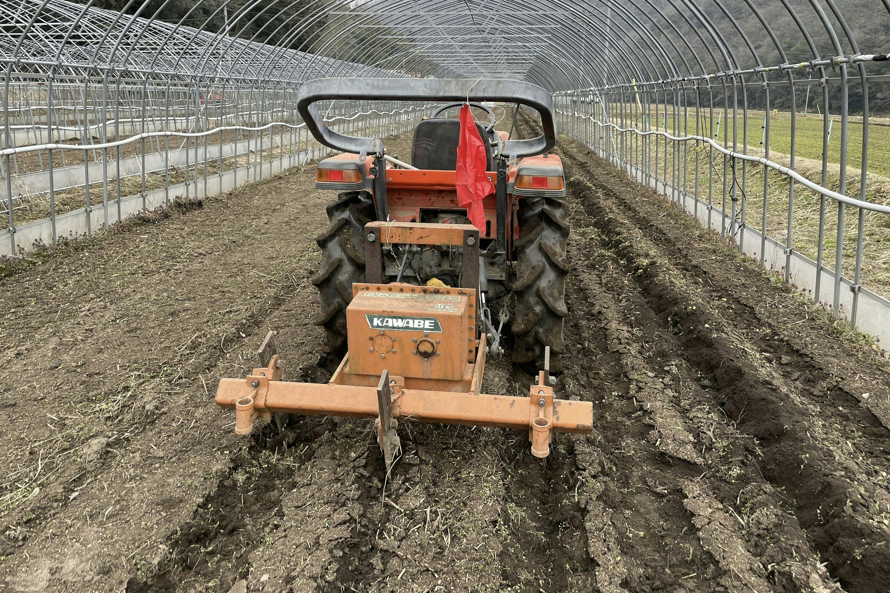 弊社では化成肥料などは使用しないため、時間はかかりますが、葡萄の根が伸びやすいふかふかの土を目指し、畑の土づくりを行っています。排水性の改善の為、バイブロソイラーというトラクターのアタッチメントを使用し、土を揺らし空気を土中に取り込みつつ弾丸暗渠で簡易的な暗渠を施工しています。その他は有機物の投入として樹皮と食物残渣を混ぜて発酵させた堆肥を散布しています。動物性の糞尿が入らない堆肥のため肥料分は少ないですが、荒い炭素を投入することにより土中微生物の活動を促し、土の団粒化を促進しています。また、冬季に剪定した枝は通常は焼却することが多いですが、弊社ではチッパーという機械を使い、粉々に粉砕して畑に散布しています。そうすることによりCo2の排出の削減、炭素の循環、微生物の増殖の助長を行なっています。
