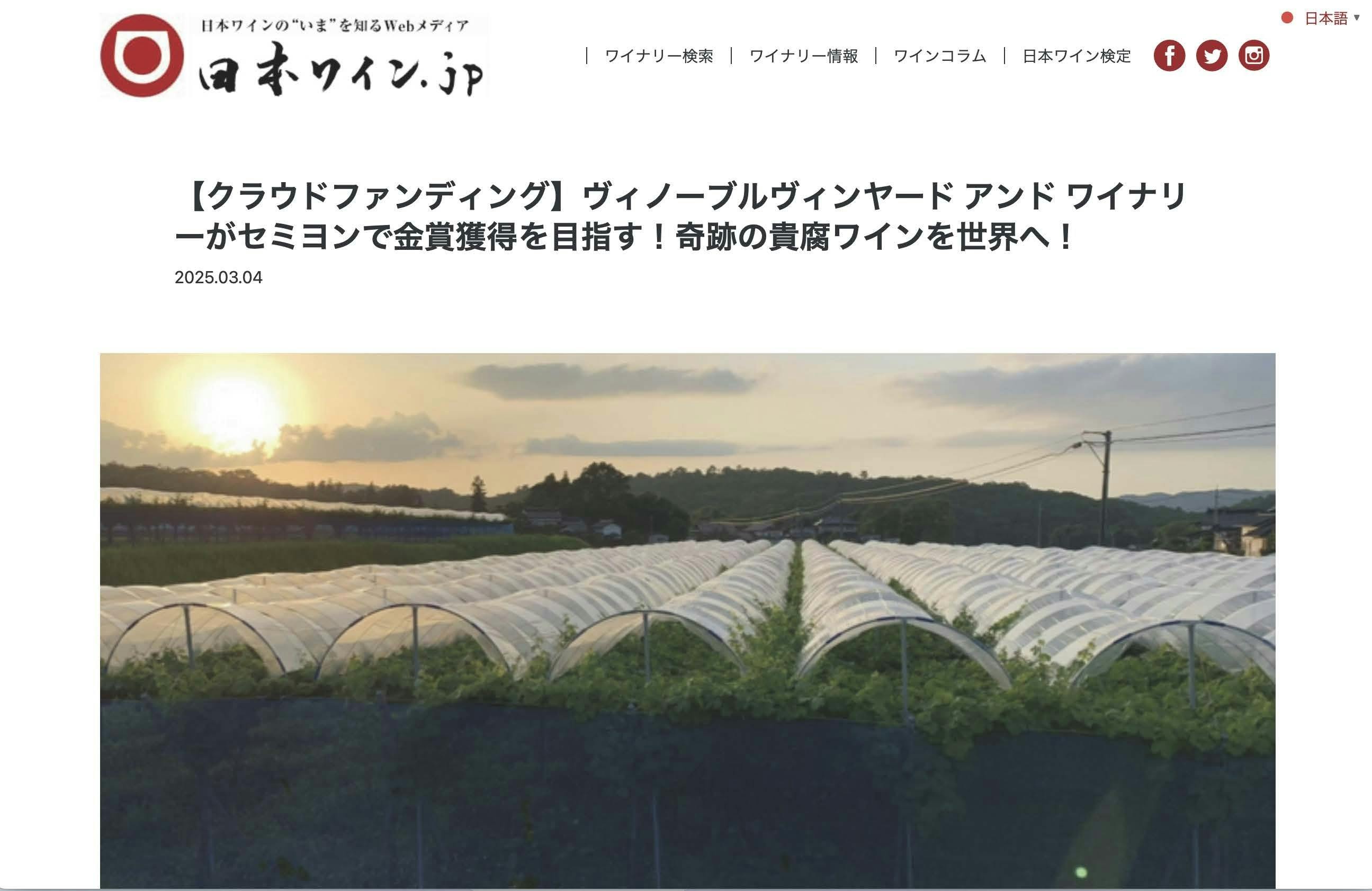 2025/03/05 18:11クラウドファンディングがスタートして2日が経過しました。スタート直後からたくさんの方にご支援を頂きとても感謝の気持ちでいっぱいです。まだまだこれからなので色んな方にクラウドファンディングでの取り組みを知っていただける様アピールしていきたいと思います。そんな中、「日本ワインの今を知るWebメディア 日本ワイン.jp」というWebメディア様が今回のクラウドファンディングについて記事にして頂けました。以前から弊社のワイン造りについて取材をしていただいた事もあり、とても詳しく記事を作ってくださっています。これから約2ヶ月間、目標を達成できるようしっかりと発信してきたいと思いますので、皆様も是非拡散をよろしくお願いいたします! もっと見る