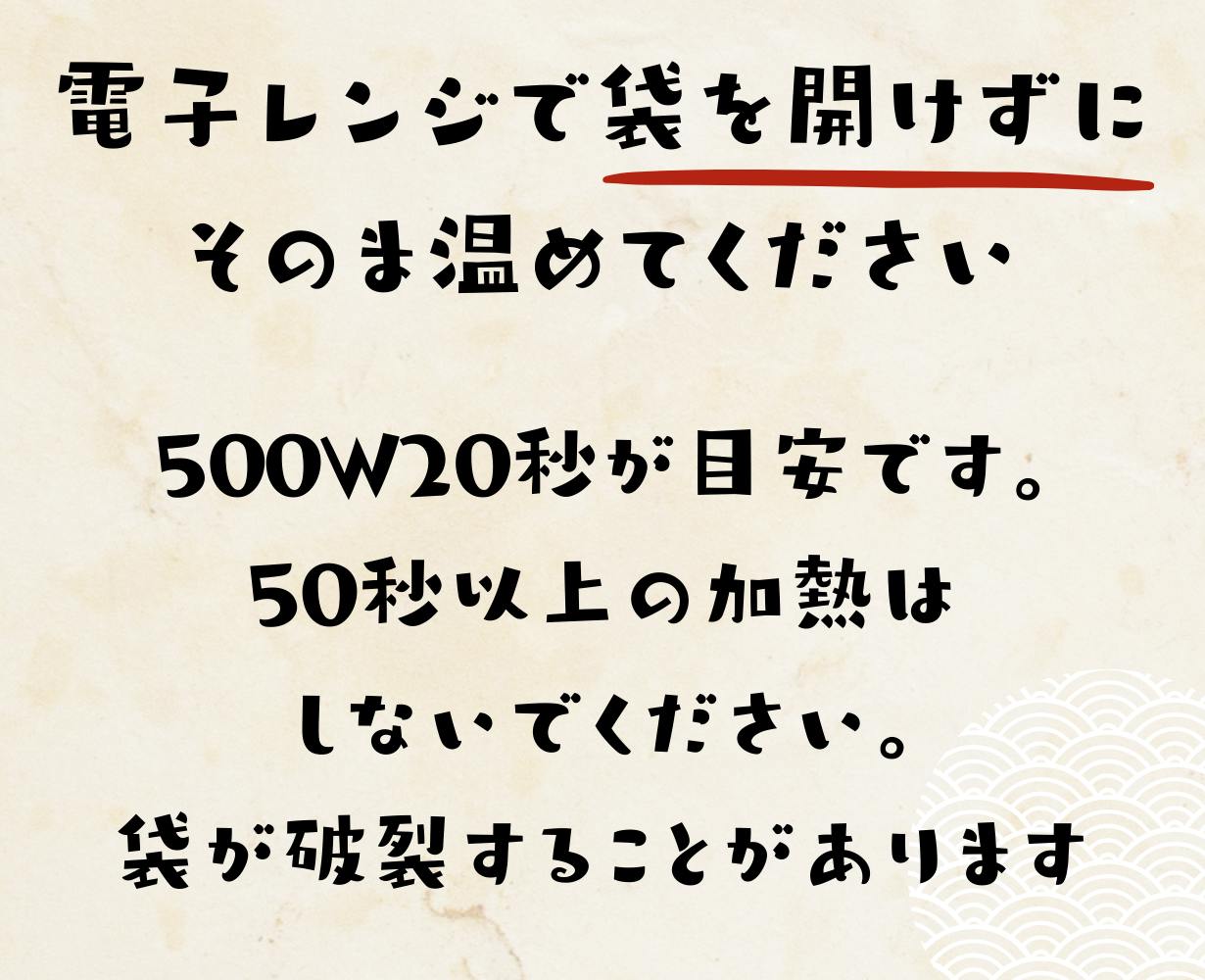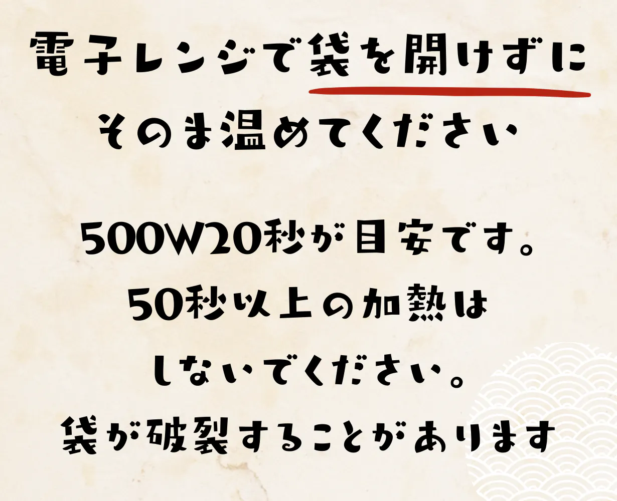 温めた直後の袋の中は熱くなっており、水分、油分がはねやすいので、袋から取り出す際は十分注意してください。