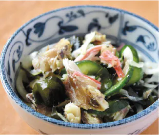 『骨までまるかじり焼き魚』をほぐして、キュウリやわかめを簡単酢で和えて出来上がり。