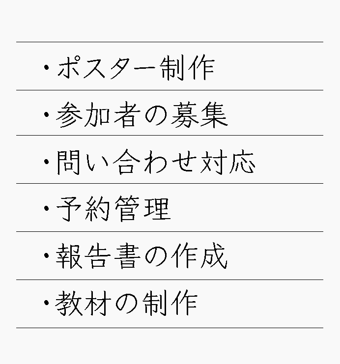ポスターを制作するだけでなく、参加者の募集、問い合わせ対応、予約管理といった「広報業務」を行うための人的リソースを含みます。