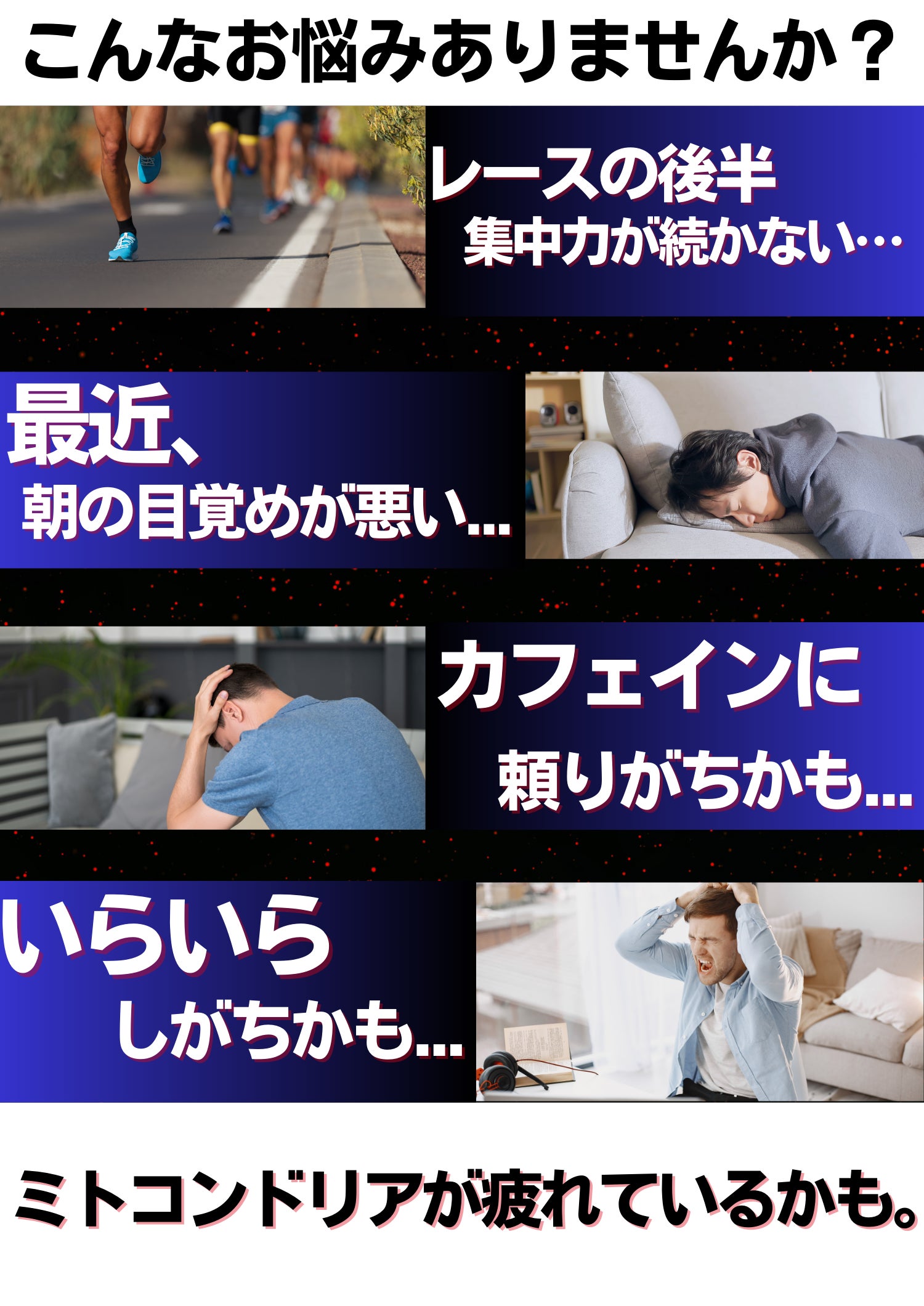 ミトコンドリアに着目して開発された、日々の元気な体作りとアクティブな生活をサポートするスポーツサプリメントです。