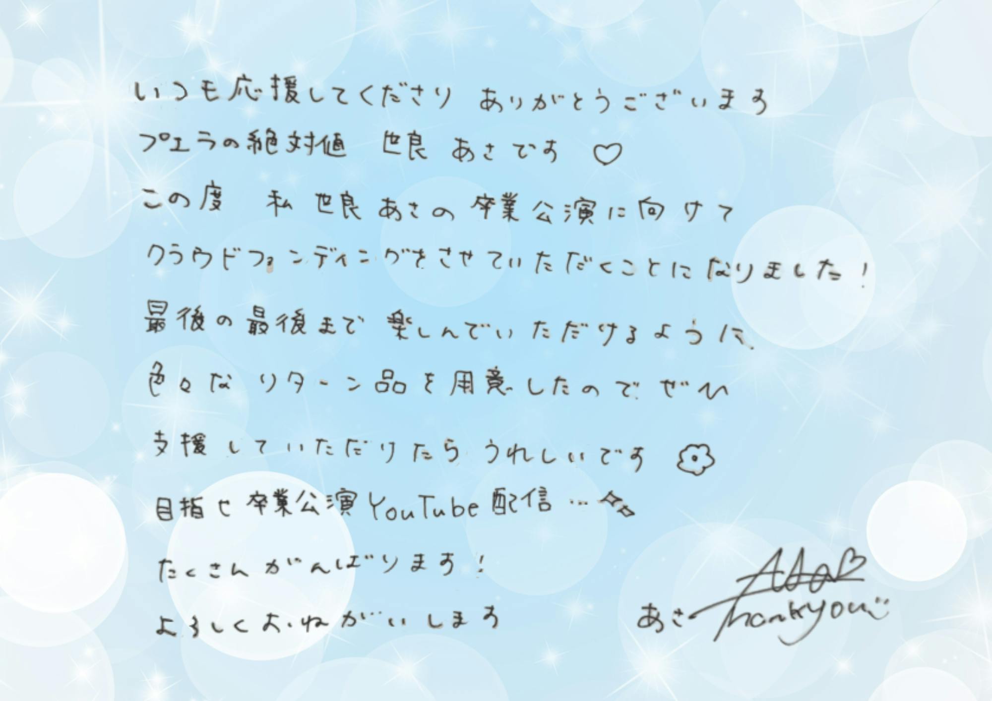ご支援いただいた金額に応じてリターン品に加え、より豪華な卒業公演を開催できるよう内容を調整させていただきますので、ご理解頂けますと幸いです。