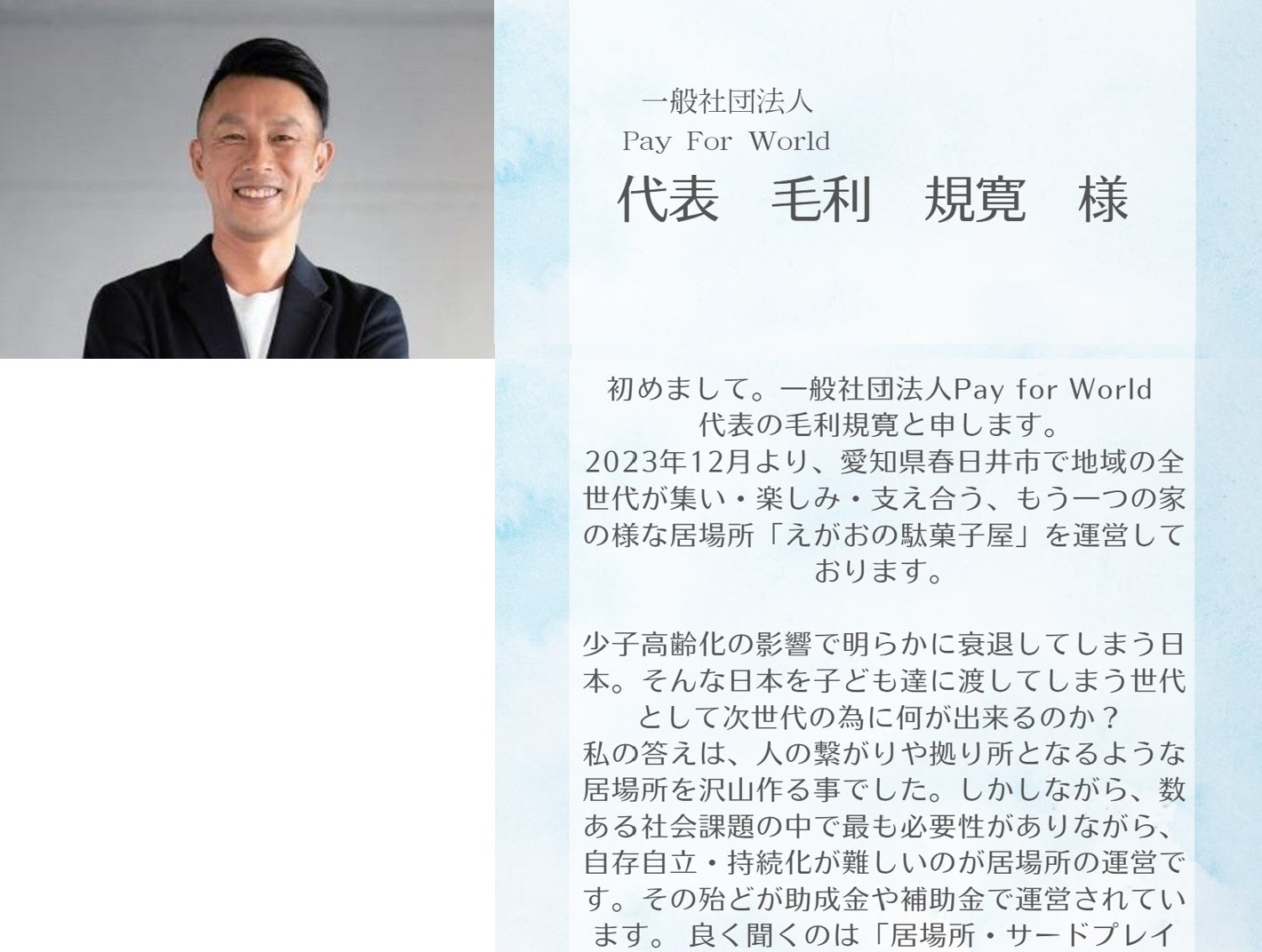 すでに愛知県の「えがおの駄菓子屋」で実施しているように地域をサポートできる体制を整えていきます。