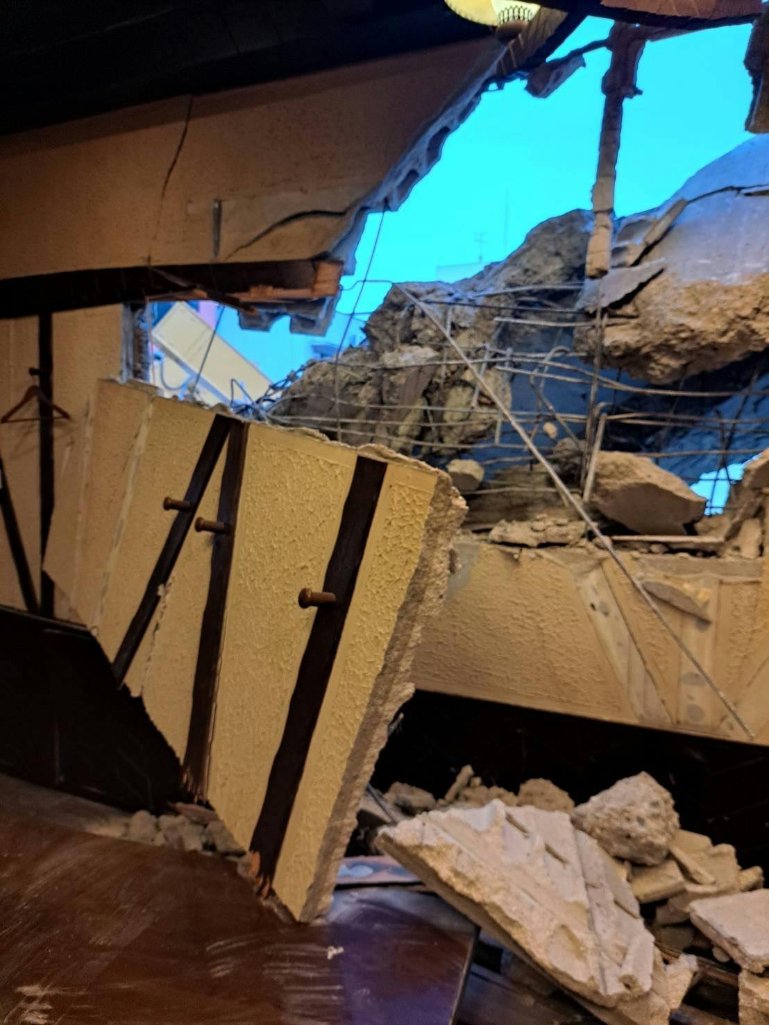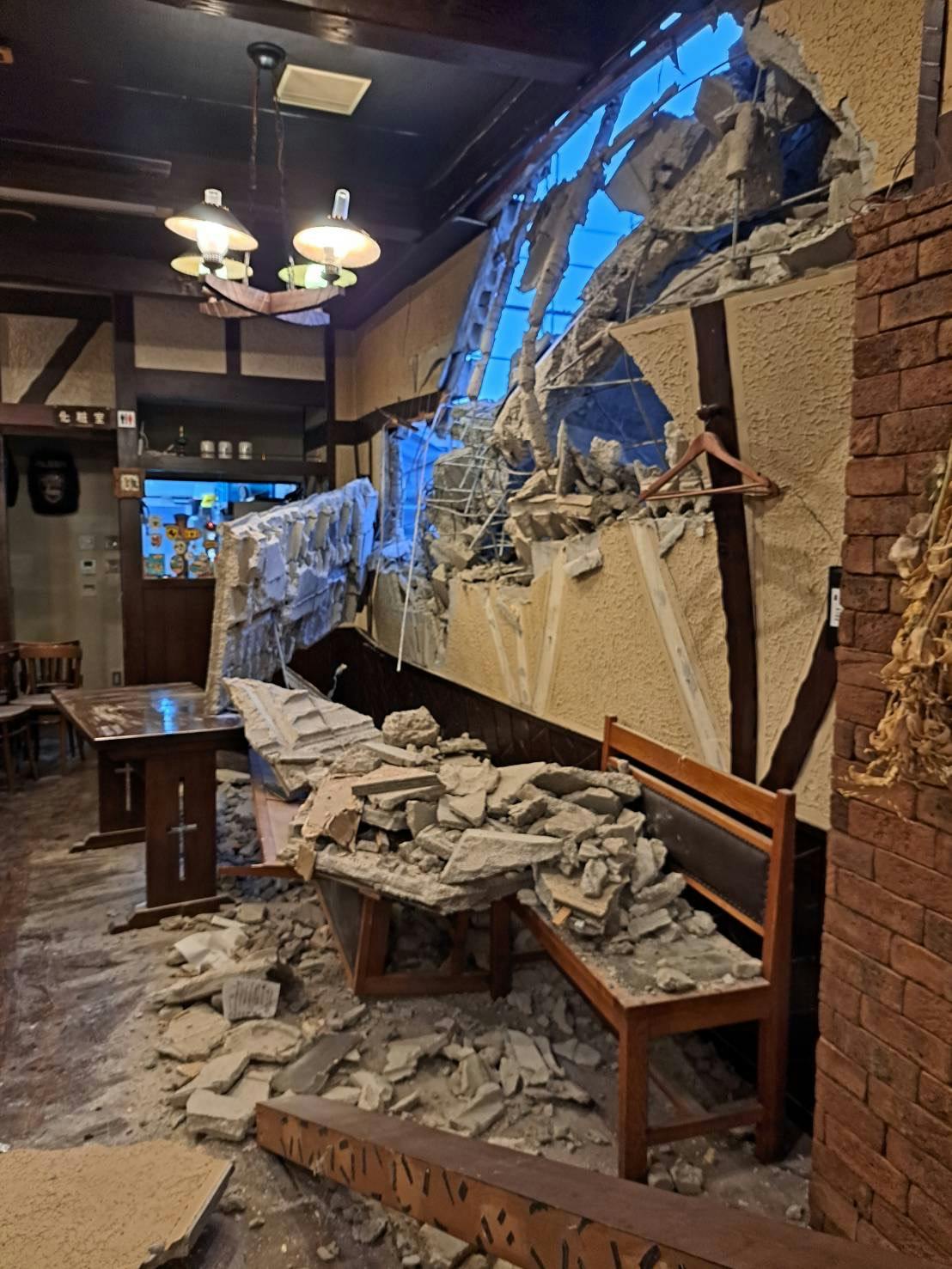防犯カメラにより、ぴるぜん2階部分の壁にもの凄い騒音と共に穴が空いて、コンクリートが店内に雪崩れ込む映像がスマートフォンに送られてきました。