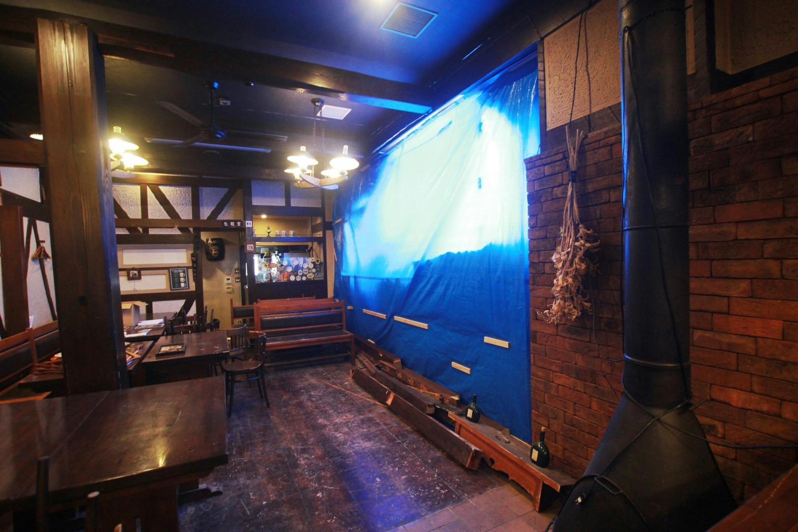 そしてこの夏、隣の解体工事中の壁、約5トンのコンクリートの塊がぴるぜんに突き刺さり、歴史ある壁は無惨に無くなり、営業ができなくなってしまいました。