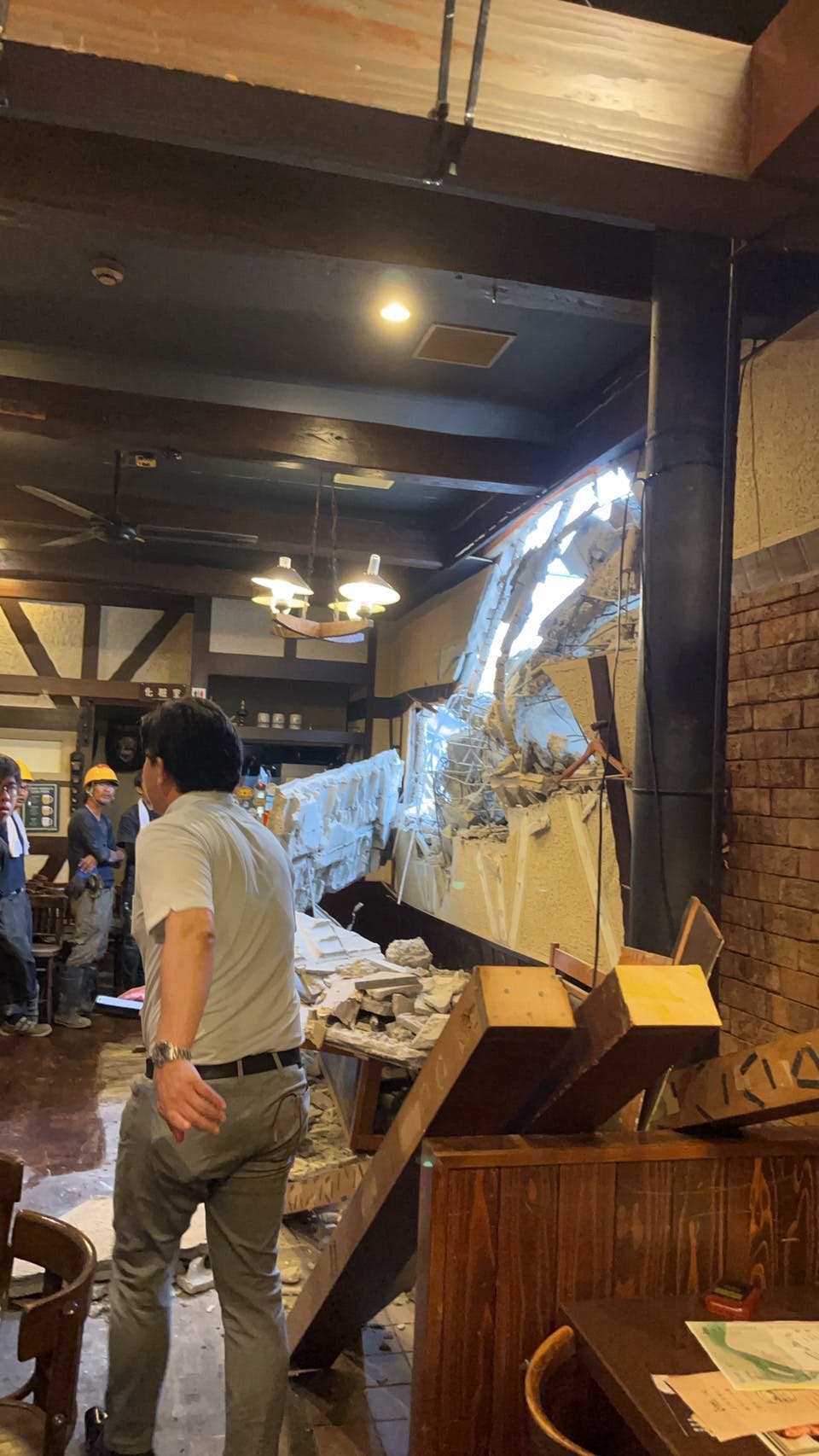 階段辺りからコンクリートの塊や粉塵だらけの床、投げ倒されたテーブルや椅子が目に入り、それでもまだ目の前で起きていることが信じられずに呆然としてしまいました。