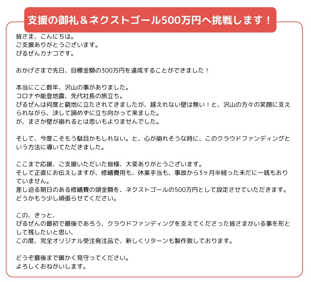 2024/11/17 14:44おかげさまで500万円を超えるご寄付に心より感謝申し上げます。この度は7月15日に起こった壁の崩落により休業をしていた当店ですが、再開に向けて進んでまいりました。しかしながら長期休業での補償や保険などの話し合いが進まず、資金不足に陥っていました。そんな中、クラウドファンディングという選択をさせて頂きましたが当初は皆様にお力添え頂く事が果たして正しい事なのか、自力で存続の道をギリギリまで考えておりました。クラウドファンディングをするにあたってご協力、ご賛同頂きコメントを寄せて頂いた『スタンド ビアとら』『旅するビアトラック』代表 小松 大輔 様ビアブルヴァード株式会社代表 佐藤 裕介 様HIGHBURY THE HOME OF BEER代表 安藤耕平 様「BIER REISE'98」オーナー 松尾光平 様に心から感謝と共に…様々な形でご協力頂いたりチャリティイベントや募金活動をして頂いた書ききれないほどのお店様や事業者様にも心より感謝申し上げます。なによりクラウドファンディングにおいて300名を超える支援者の皆様のおかげさまで5,146,000円のご寄付を賜りました。12月1日の再開に向けて「ぴるぜん」が前に進めたのは、沢山の想いとお力添えを頂いたクラウドファンディングなくして出来ませんでした。感謝の気持ちをどれだけ伝えても伝わらないくらいに感謝の想いでいっぱいです。本当にありがとうございました。再開がゴールではありません。皆様の想いと共にこの先お店として何世代と親しまれる「ぴるぜん」として在ることがなによりの恩返しだと思っています。そのためには美味しいビールとお料理、なによりも代え難い場所として日々鍛錬してスタッフ一同頑張っていきます。今後のぴるぜんもどうかよろしくお願い致します。 もっと見る