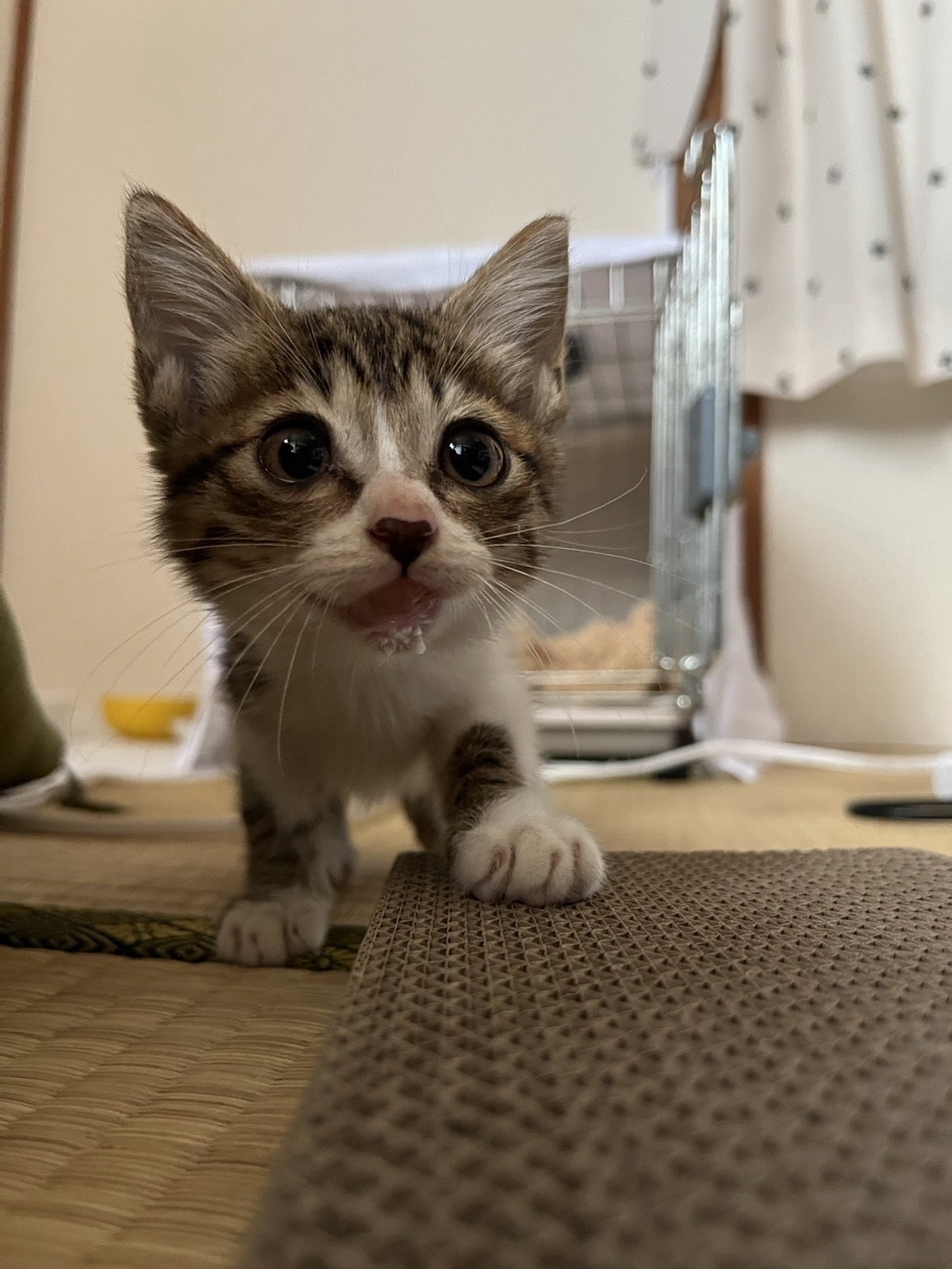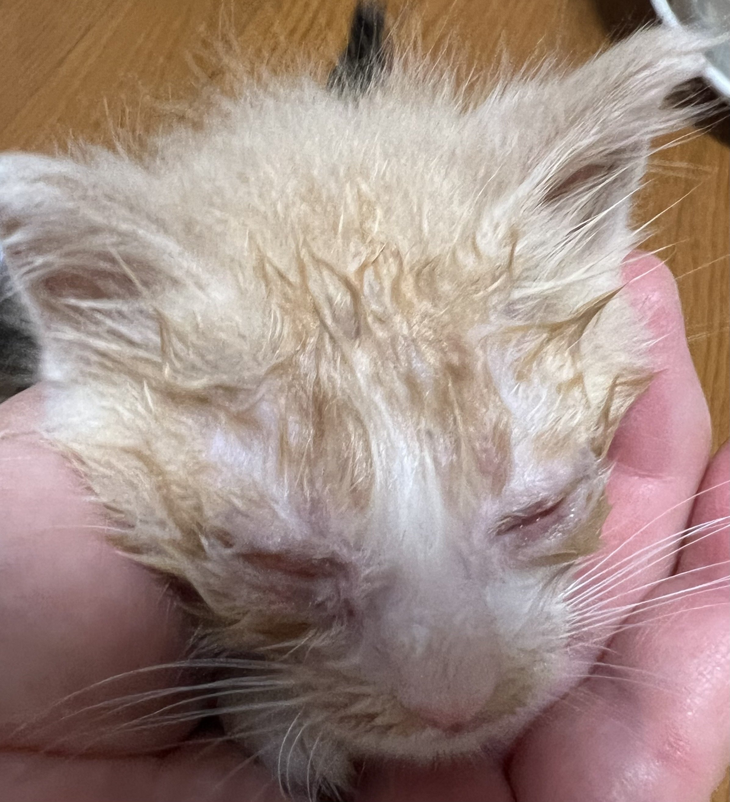 (↑眼球癒着のため目が開かない状態の子猫)