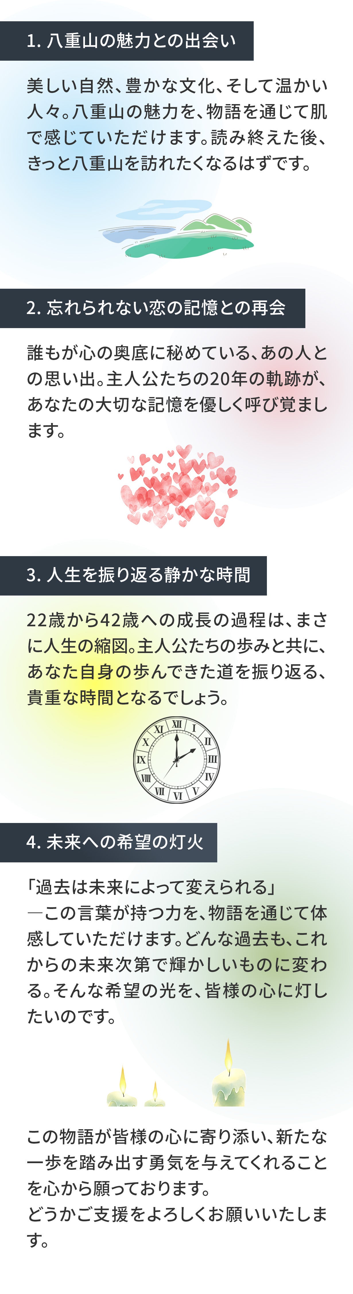そのために、今後も八重山を舞台にした物語を丁寧に描き続け、多くの方々の心に響く物語を紡いでいきたいと思います。