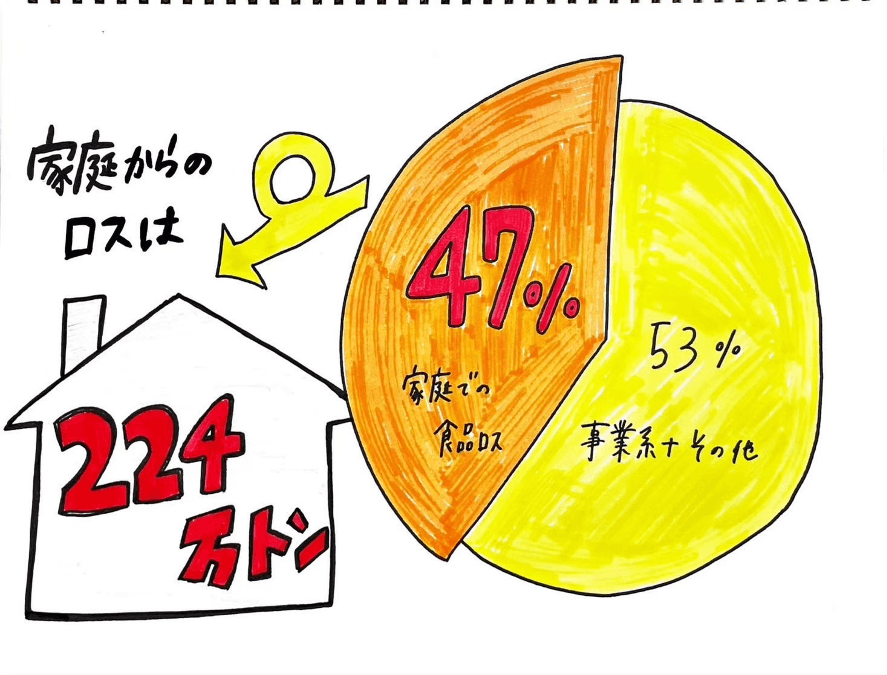 私たちがSDGs達成のためにまず目を付けたのは「食品ロス」でした。「食品ロス」は毎日大量の食べ物が食べ残しや期限切れといった理由で廃棄され、日本だけでなく世界的に大きな問題となっています。そこから「食品ロス」という大きな課題をもっと細かく見ていくと、1年に発生する食品ロスの約47%が家庭から発生しているということが分かりました。