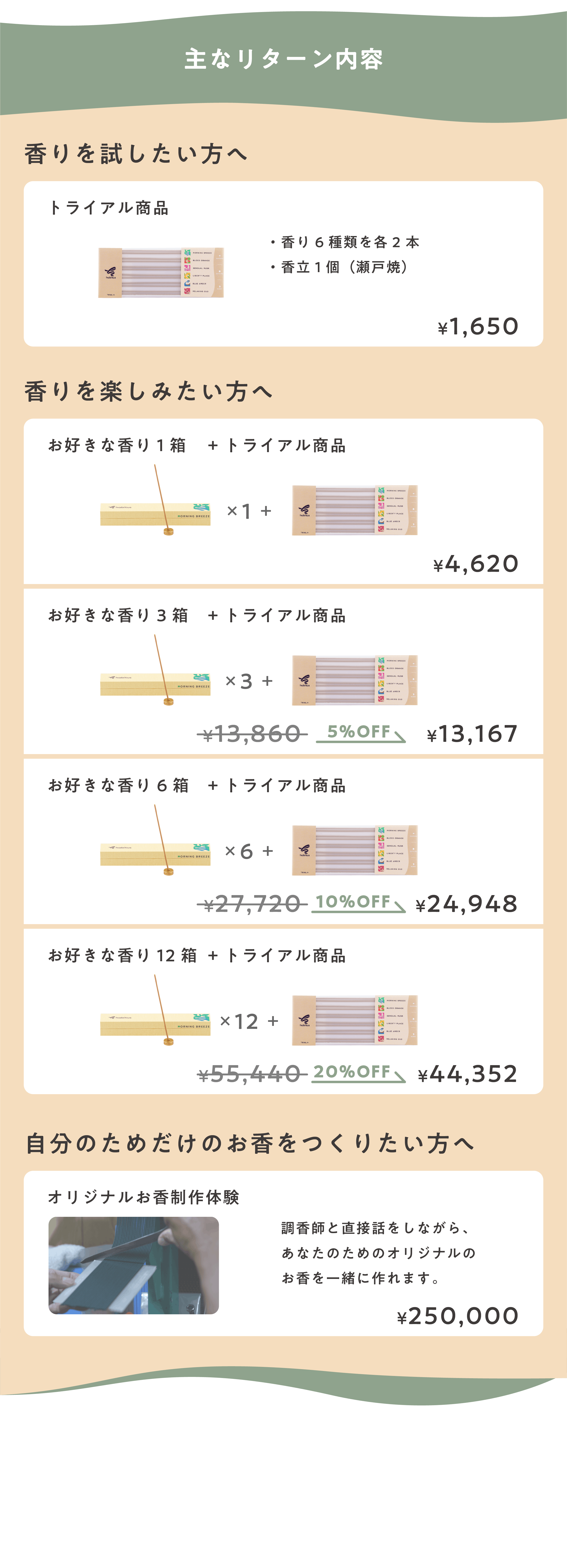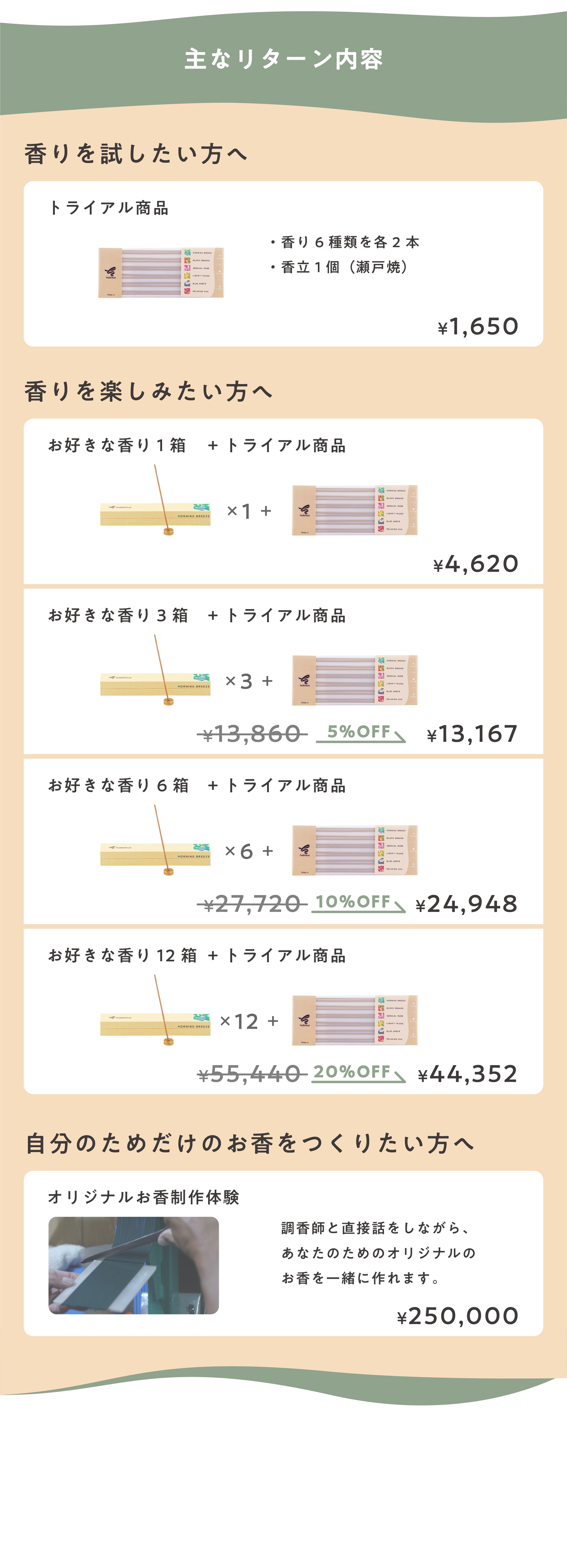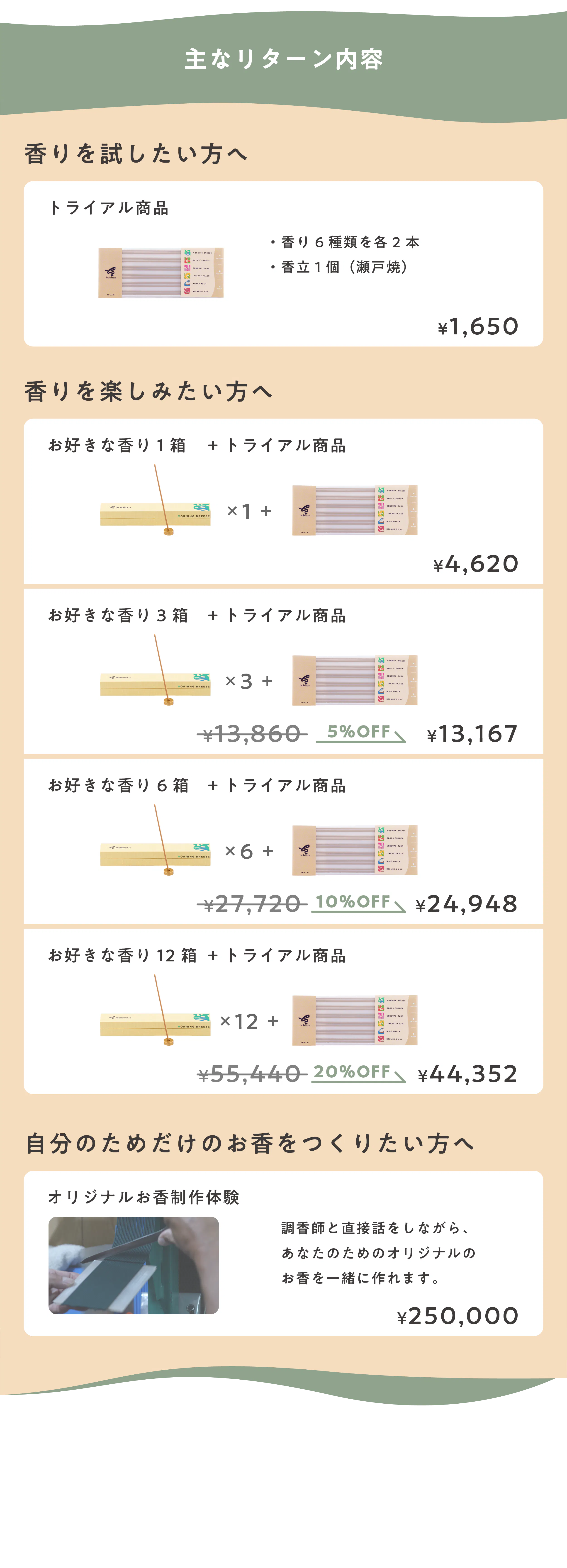 そのためにも、このプロジェクトを通じて、お客様一人一人に合わせた香りを制作する『店舗』を設立するためのプロセスとして、Stick typeのお香を販売したいと考えています。