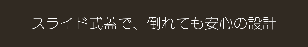 スライド式の蓋を採用しており、倒れても蓋が開かない安全設計です。安全性を確保しながらも、より快適に香りを楽しんでいただくためのデザインです。