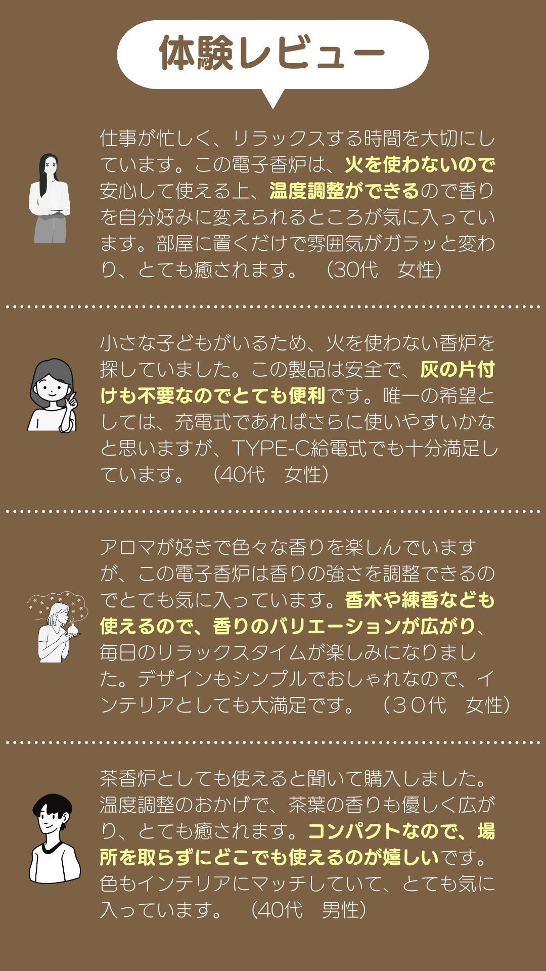 現代の生活は、テクノロジーの進化により便利になった反面、ストレスや忙しさが増えています。この電子香炉は、そうした忙しい日々の中でも、誰もが手軽に香りを楽しみ、リラックスできる時間を提供したいという思いから生まれました。