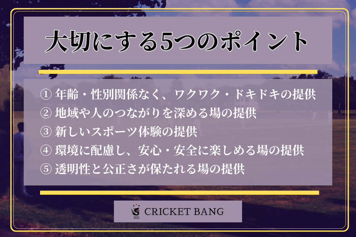 CRICKET BANGは、クリケットの国内普及はもちろんですが、ひとつのスポ-ツ・レクリエーションゲームとして楽しめる内容にしています。そして、このゲームを開催するうえで、大切にしたいポイントが5つあります。