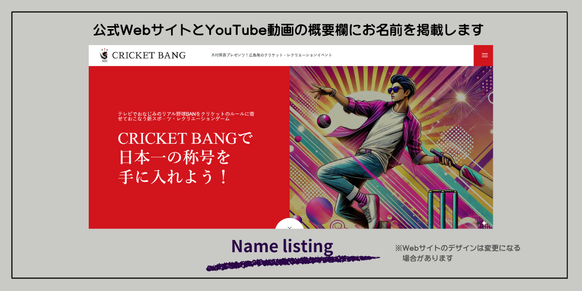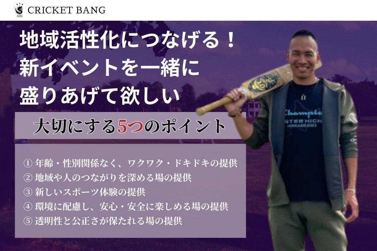 野球場などのグラウンドで、思いっきりボールを打ち、打ったボールの行方で判定された内容を元に、相手チームと点数を競います。リアル野球盤のような楽しさはそのままに、クリケットのルールにアレンジした木村昇吾プロデュースのオリジナルゲーム「CRICKET BANG」を広島を聖地として日本全国で開催していきます。