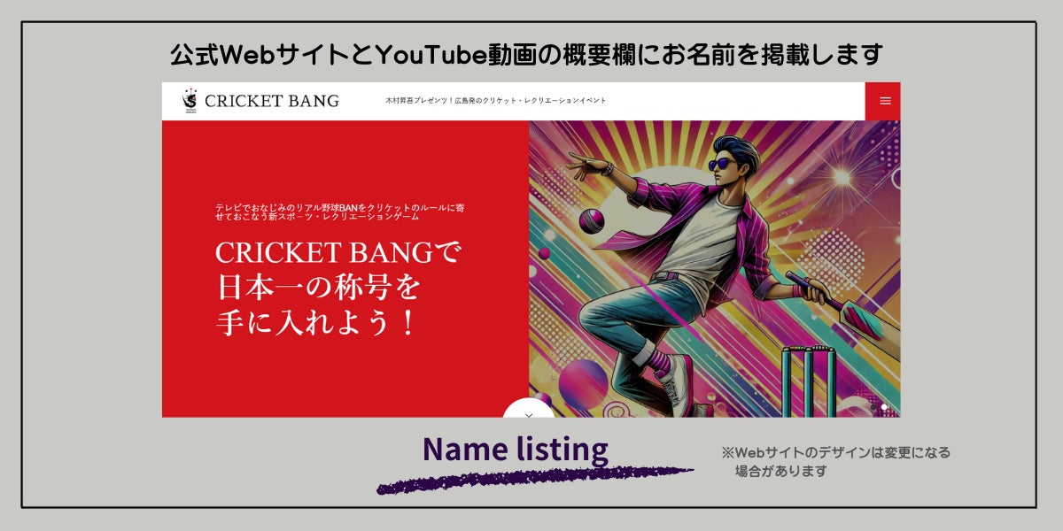 ーお名前掲載2025年1月中旬公開予定のCRICKET BANG公式Webサイトと2025年にYouTubeチャンネルで公開する動画全ての概要欄に、支援者様のお名前(ニックネーム可)を掲載します。※掲載箇所:2025年3月1日〜2025年12月31日の期間に公開したYouTube動画の概要欄※掲載方法:文字のみ、ロゴ/バナーの掲載は不可