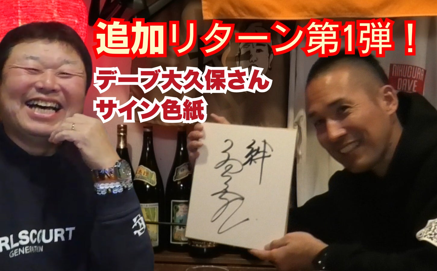先日、本プロジェクトの説明をし、快くご協力を賜ったデーブ大久保さんのサイン色紙をリターン品に追加いたしました。併せて私のサイン色紙とオリジナルステッカーもセットでお届けいたします。