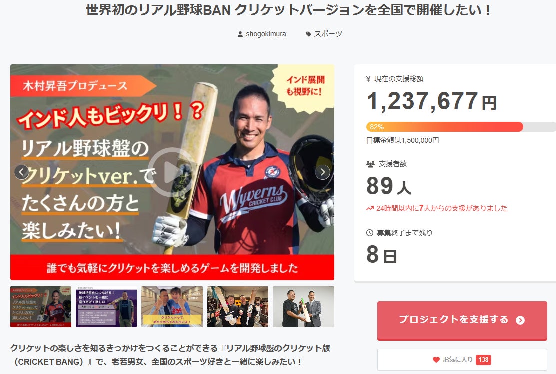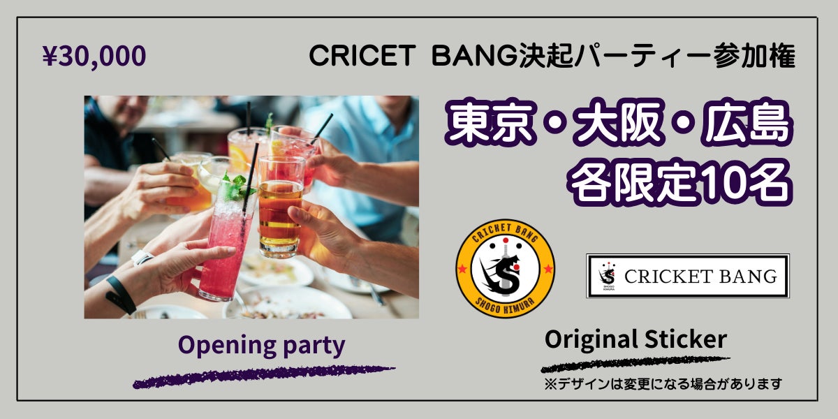 リターンでは、『東京・大阪・広島 各10名限定!CRICKET BANG決起パーティー参加権利』がまだまだ空きが残っております。