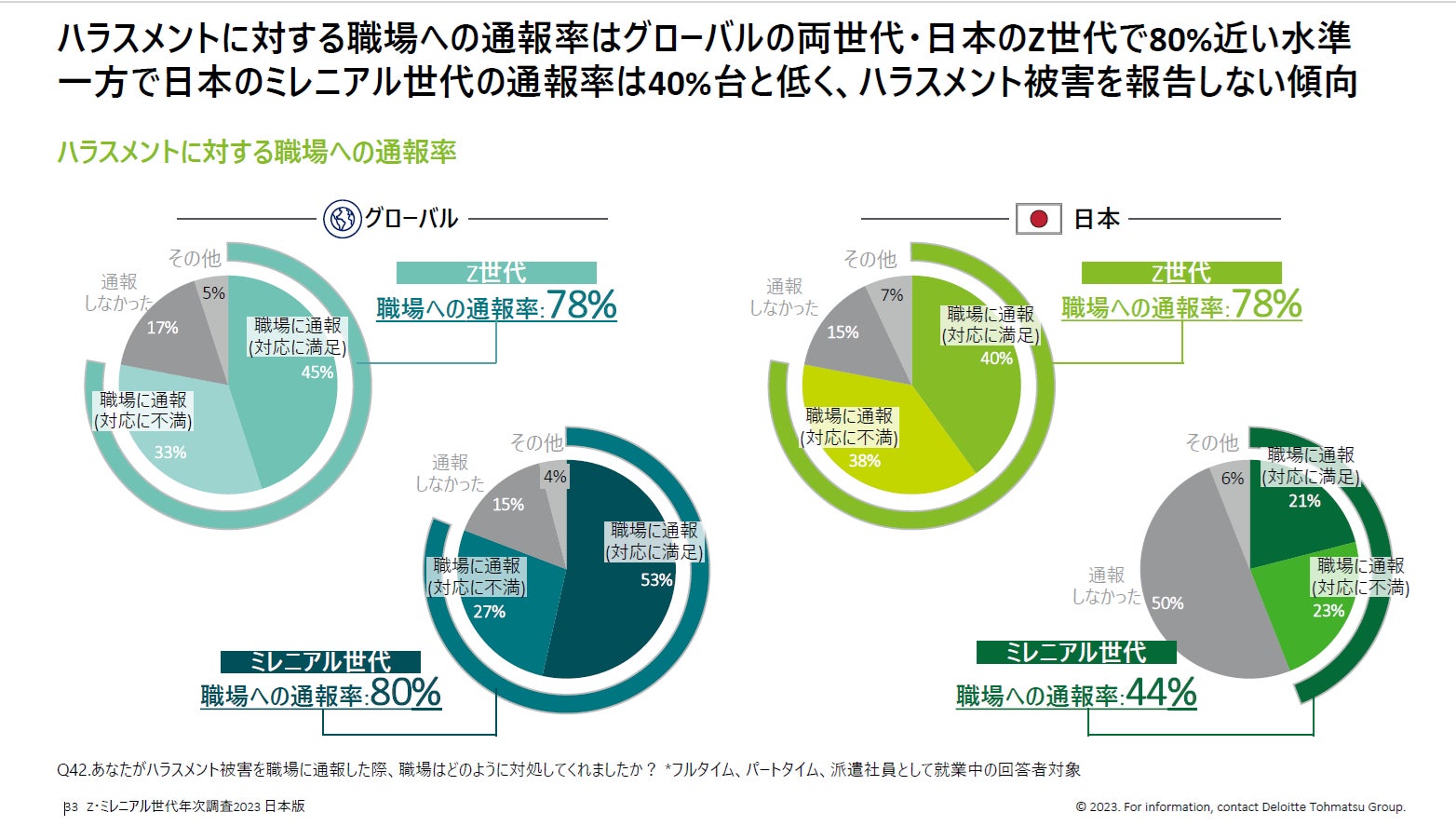 デロイトトーマツの調査によると、ハラスメントに対する職場への通報率はグローバルの両世代・日本のZ世代で80%近い水準であるのに対し、一方で日本のミレニアル世代の通報率は40%台と低く、ハラスメント被害を報告しない傾向があることがわかっています。(Z・ミレニアル世代年次調査2023より)