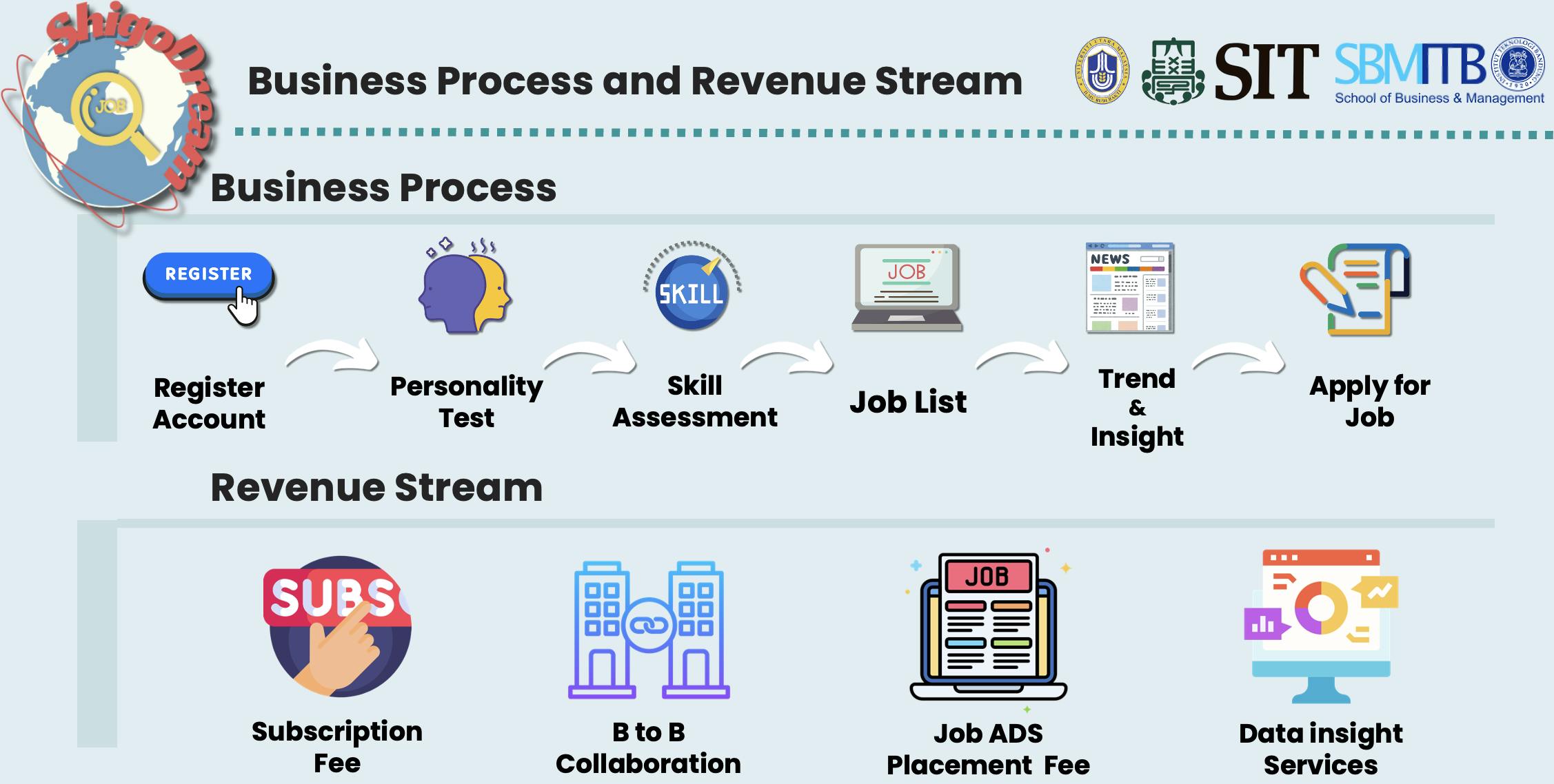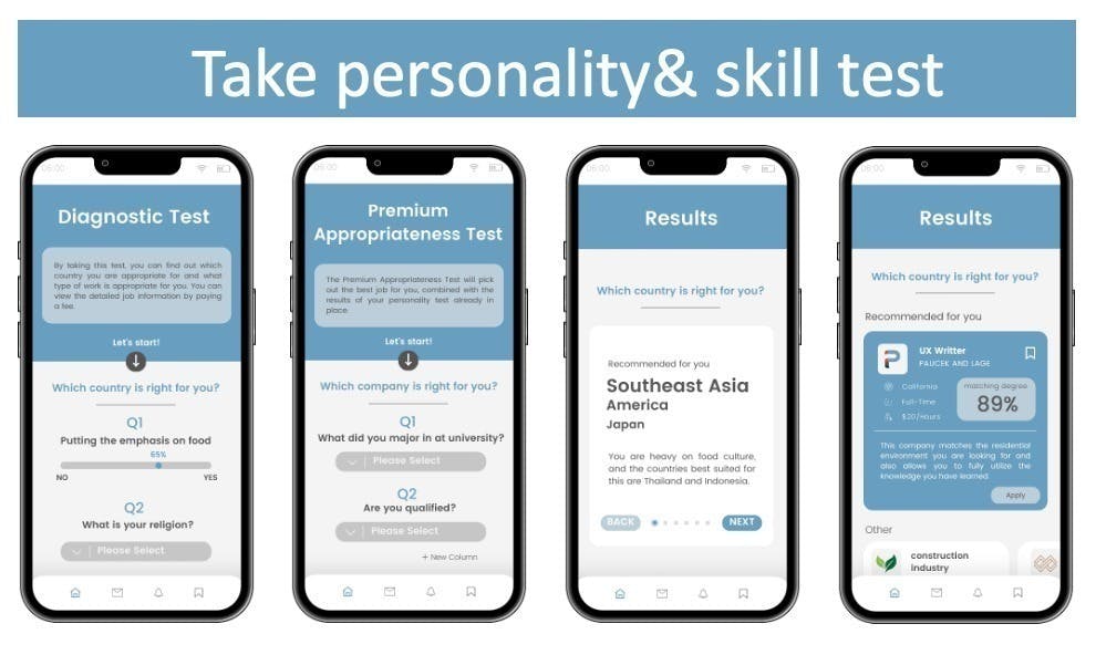 まず、求職者はアカウントを作成した後に、私たちが提供するパーソナリティテストとスキルテストを行います。その結果をもとに、私たちが既存のデータから構築する機械学習モデルを使用して各個人に適した提案を行います。求職者はその提案を受け、私たちが提供する申込先へのリンクを通して仕事の申し込みを行います。