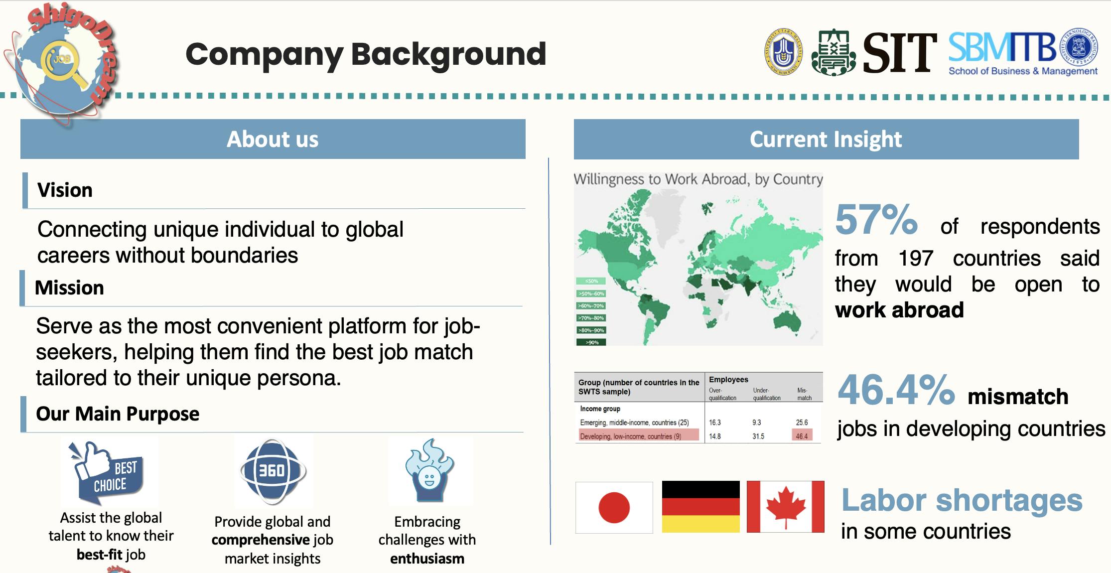 The project was designed to solve the problem that many people around the world have a need to work abroad, but actually have few opportunities to work or access to information.