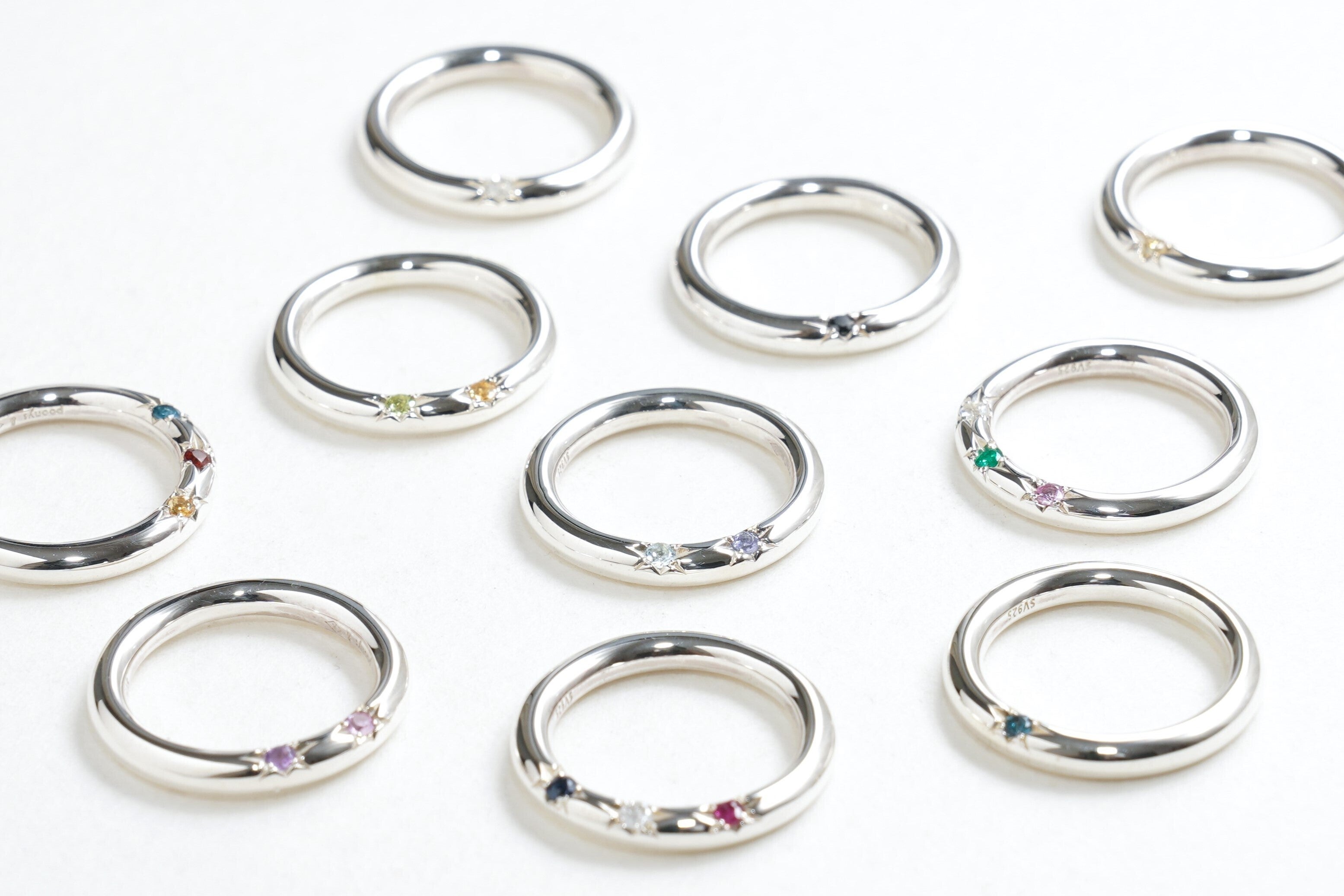 12か月分の誕生石に、CAMPFIRE限定石4種を加えた計16種類の天然石をご自身で組み合わせてカスタムして作るこのリングは、お客様のご要望を元に幅や石の数などを変えてバリエーションを増やしていっているシリーズです。