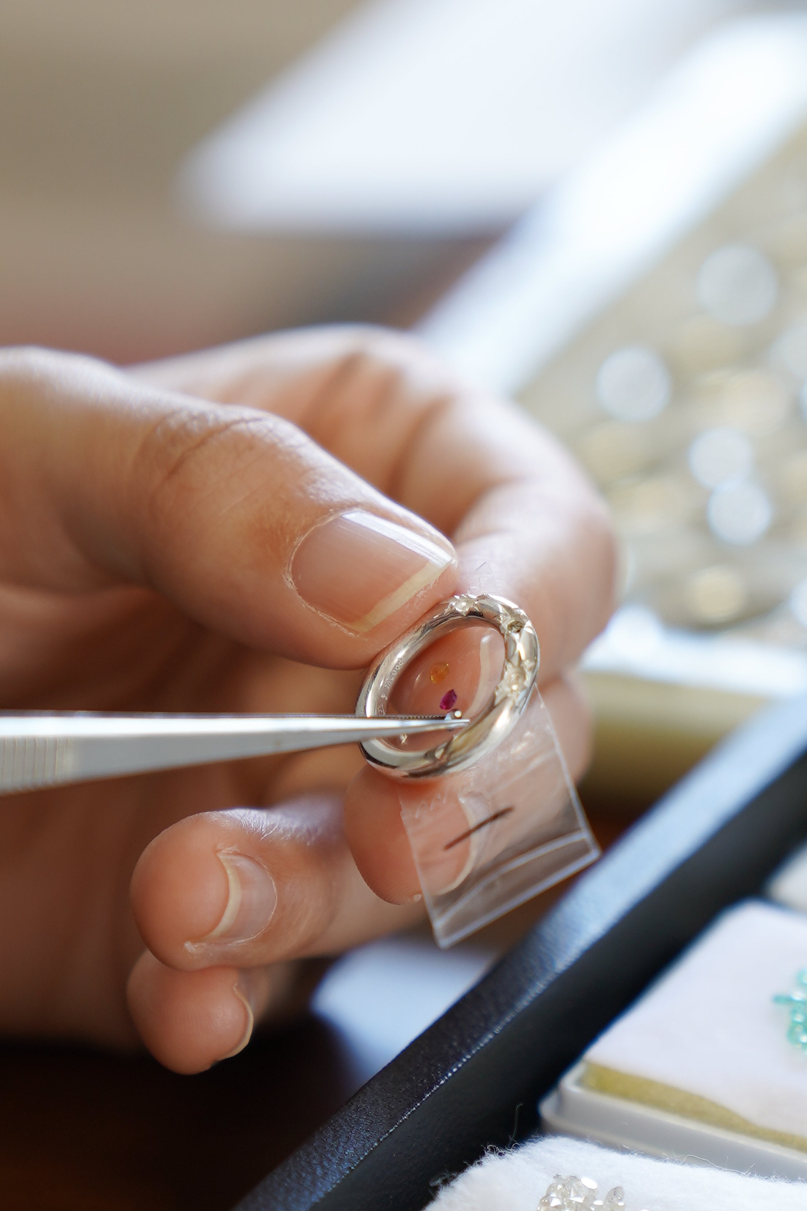 皆さまにお届けするために、現在鋭意製作中です!今回は、職人の方々に石留めをお願いする前に行う【石合わせ】の風景をちょこっとお見せしようかと思います。