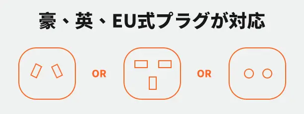 豪州、英国、EUの3つの規格に対応したアダプターを搭載しており、プラグを直接差し込むだけで使用できるので、どこへ行ってもプラグの互換性を心配する必要はありません。